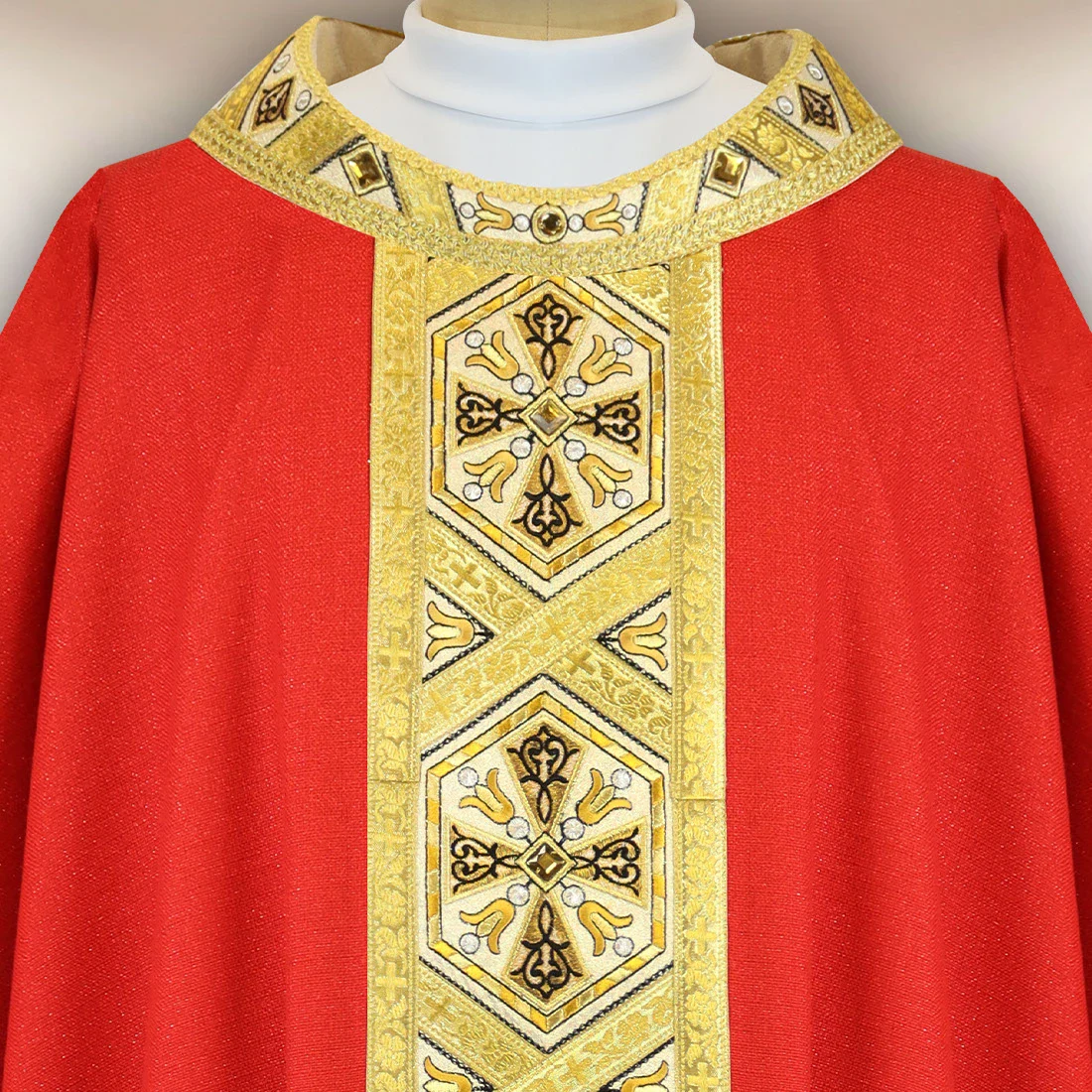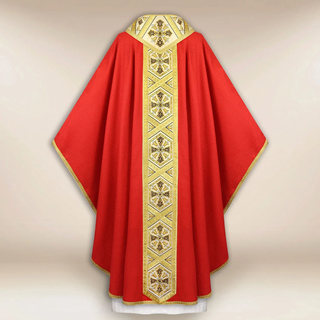 Embroidered red chasuble with crosses is a liturgical vestment intended for celebrations of exceptional symbolic power: the feasts of the Apostles, Evangelists, Martyrs, and events related to the Holy Spirit. Red, historically associated with fire, the Holy Spirit, and the testimony of faith, gives the vestment intensity and a solemn character. From the very first glance, the red chasuble with crosses emphasizes the significance of the celebration while maintaining classic restraint.
