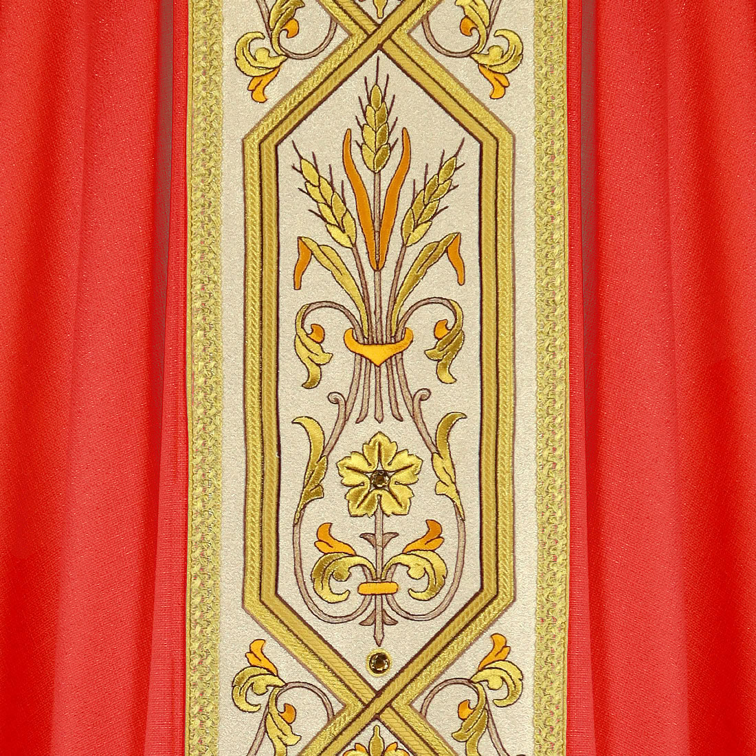 The central element of the chasuble is a richly embroidered band, featuring floral motifs and eucharistic symbols carefully crafted with gold thread. The embroidery is further enhanced by hand-set stones, giving the whole piece a noble shine and sacred depth. The garment is finished with Italian trimmings woven in an old gold shade, highlighting the craftsmanship and liturgical tradition.