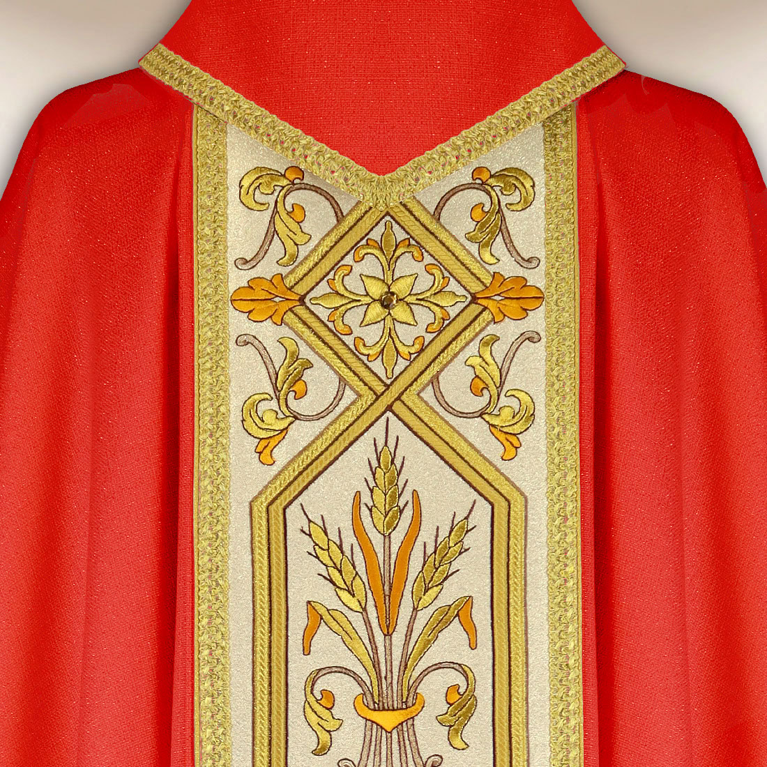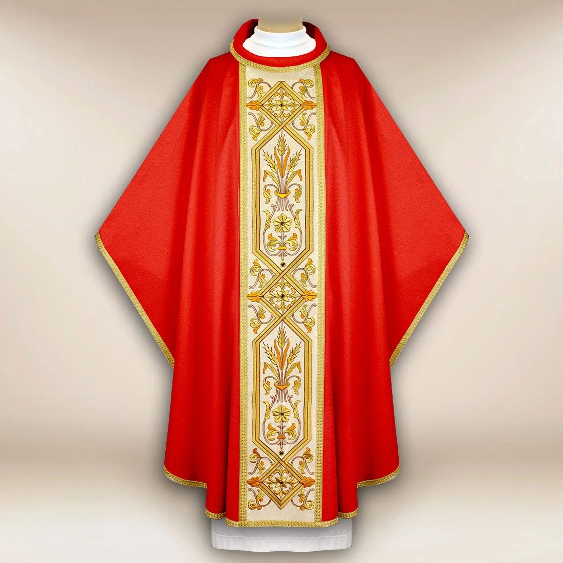 Red embroidered chasuble with a band includes a matching inner stole, maintained in the same style, making the entire set exceptionally harmonious. The universal size ensures that the garment is suitable for any priest. It is an excellent choice for holidays, parish celebrations, and special Masses.