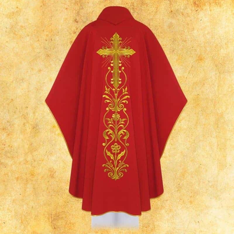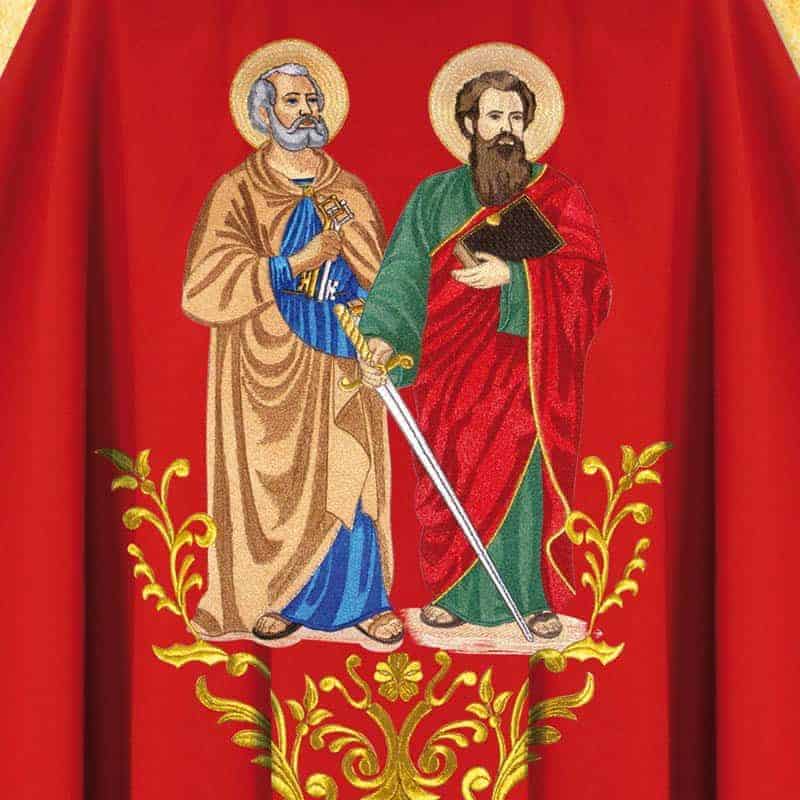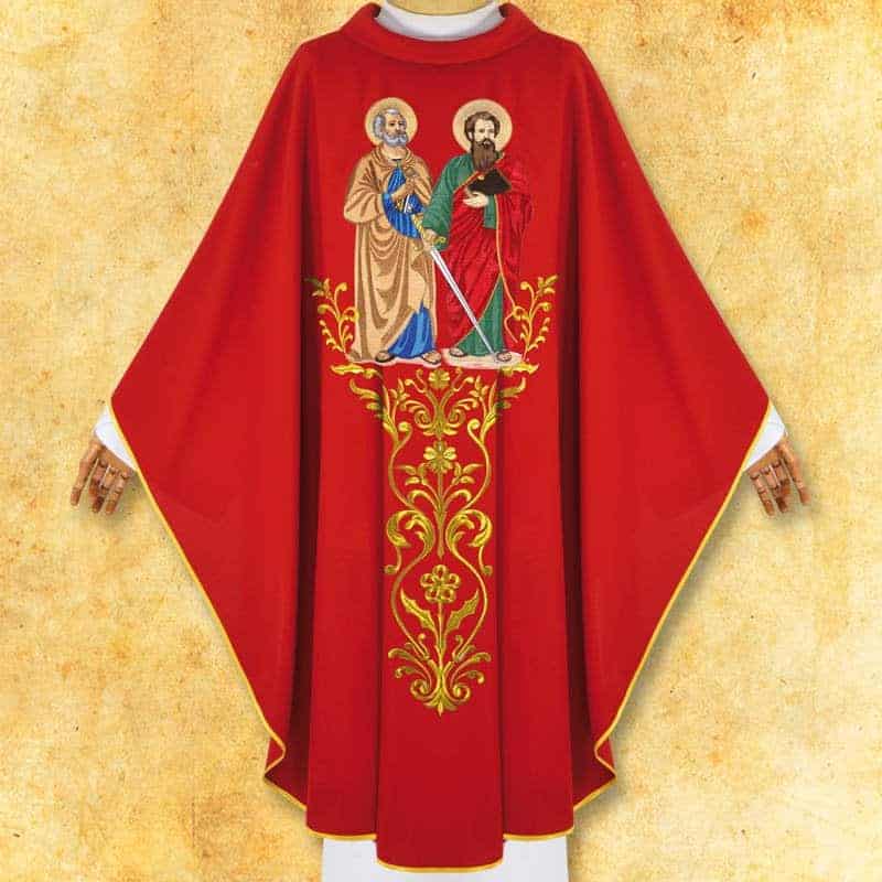Made of high-quality fabric, which is a blend of carefully selected fibers, it combines durability, elegance, and comfort. The fabric is light, soft, and drapes beautifully, giving the chasuble a dignified appearance in every celebration. The red embroidered chasuble “St. Peter and Paul” stands out among other liturgical vestments, making it a unique element of every important ceremony.The central element of the vestment is the rich embroidery depicting Saints Peter and Paul, which gives the chasuble deep symbolism and a unique character. Thanks to its classic cut and precise finish, the chasuble is perfect for />Thanks to its classic cut and precise finish, the chasuble is perfect for solemn Masses, apostolic feasts, and important liturgical celebrations. The red embroidered chasuble “St. Peter and Paul” looks particularly solemn during apostolic feasts, which emphasizes its uniqueness.lt;/p>