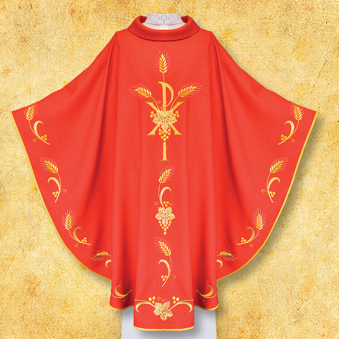 An exclusive liturgical chasuble with an embroidered PX motif (Christogram), made of the highest quality SACROLINE fabric in red, subtly interwoven with gold thread.