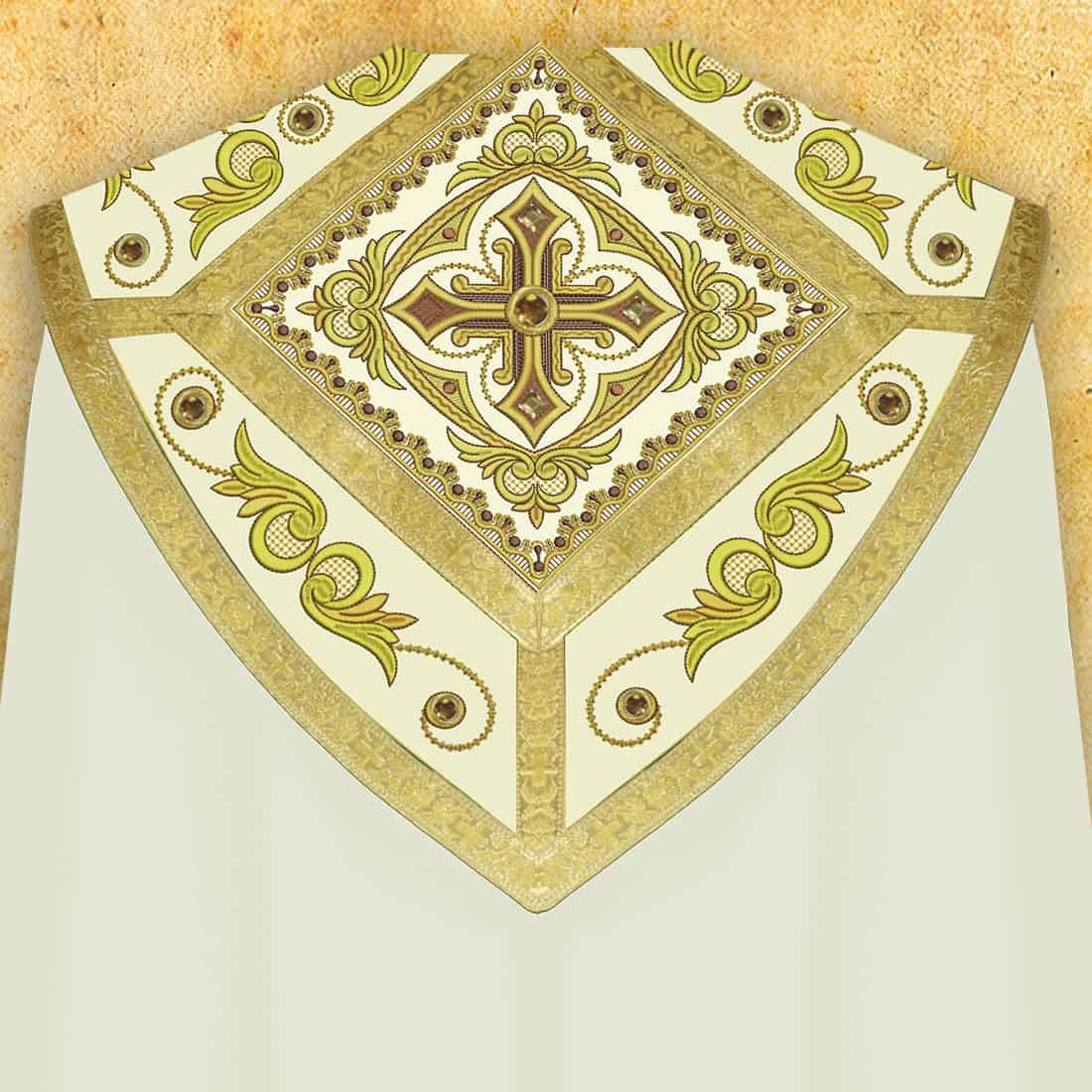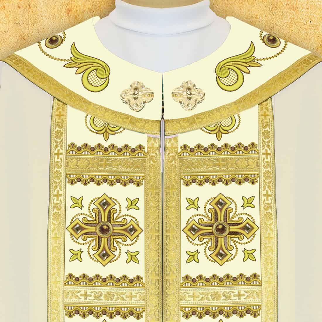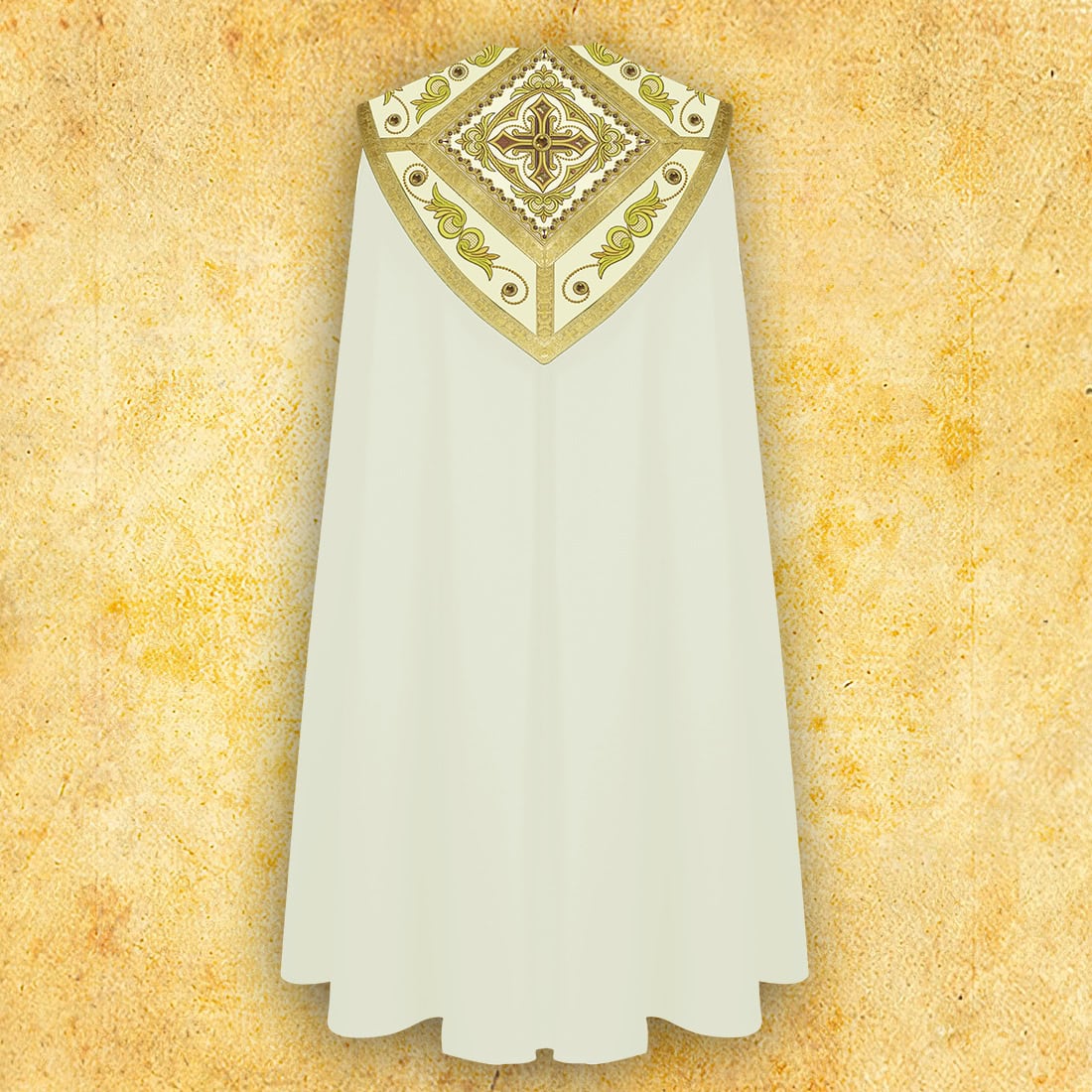 Liturgical cope made of high-quality satin fabric, combining natural and synthetic fibers.Soft, elegant, and comfortable to wear, perfect for solemn celebrations.The collar, braids, and stole made of Satinowool fabric are decorated with rich gold thread embroidery and hand-applied stones, which give the cope a unique, luxurious character.The whole is complemented by Italian trimmings in old gold color.The set includes a matching inner stole.One size fits all.