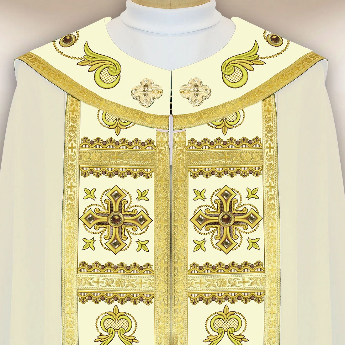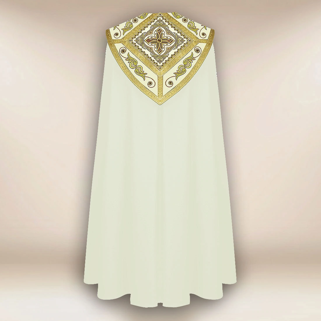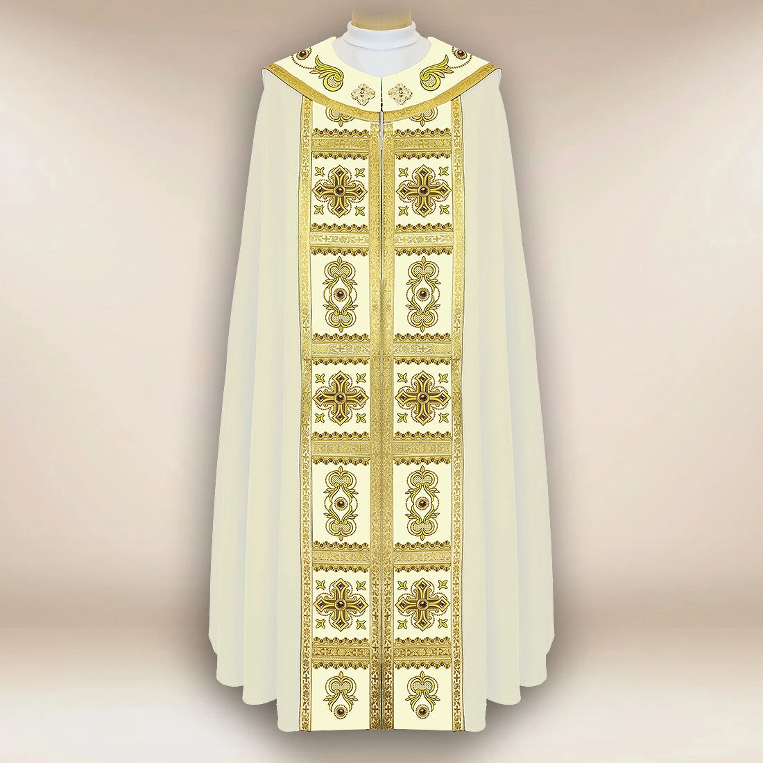 Ecru liturgical cope with crosses is suitable for Holy Masses, services, processions, and solemn celebrations. Its dignified appearance, refined decorations, and careful finishes make it a choice for priests and liturgical ministers who value the highest quality of workmanship and liturgical elegance.