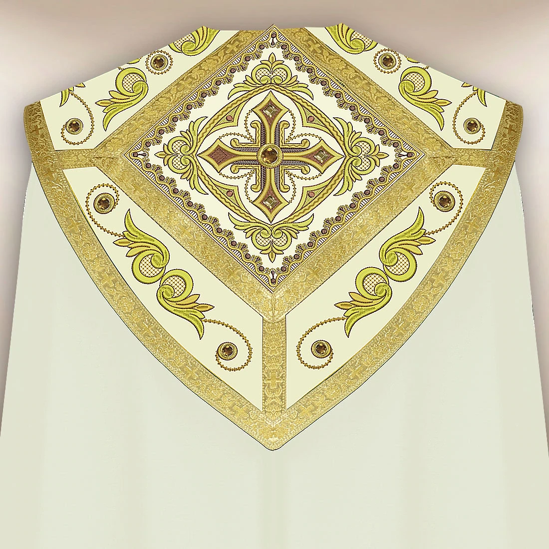 The collar and galloons, made from Satinowool fabric, are adorned with dense embroidery in gold thread. The ornament of crosses features clear liturgical symbolism, and the hand-applied stones give the whole piece luminosity and noble shine. Their precise setting is characteristic of the Urbanowicz Haft Polska workshop, where every element of the garment is crafted with attention to the smallest details.