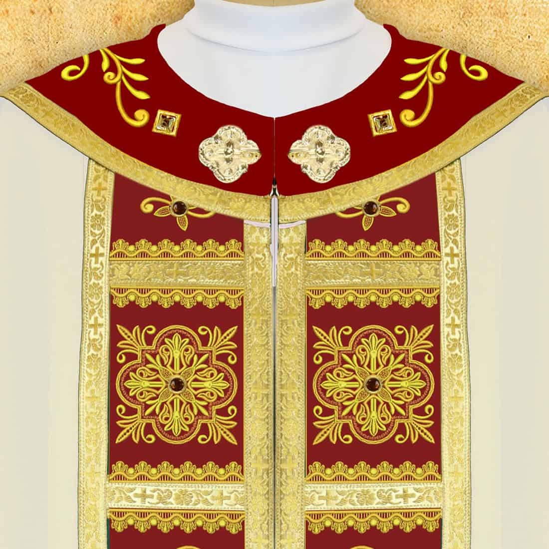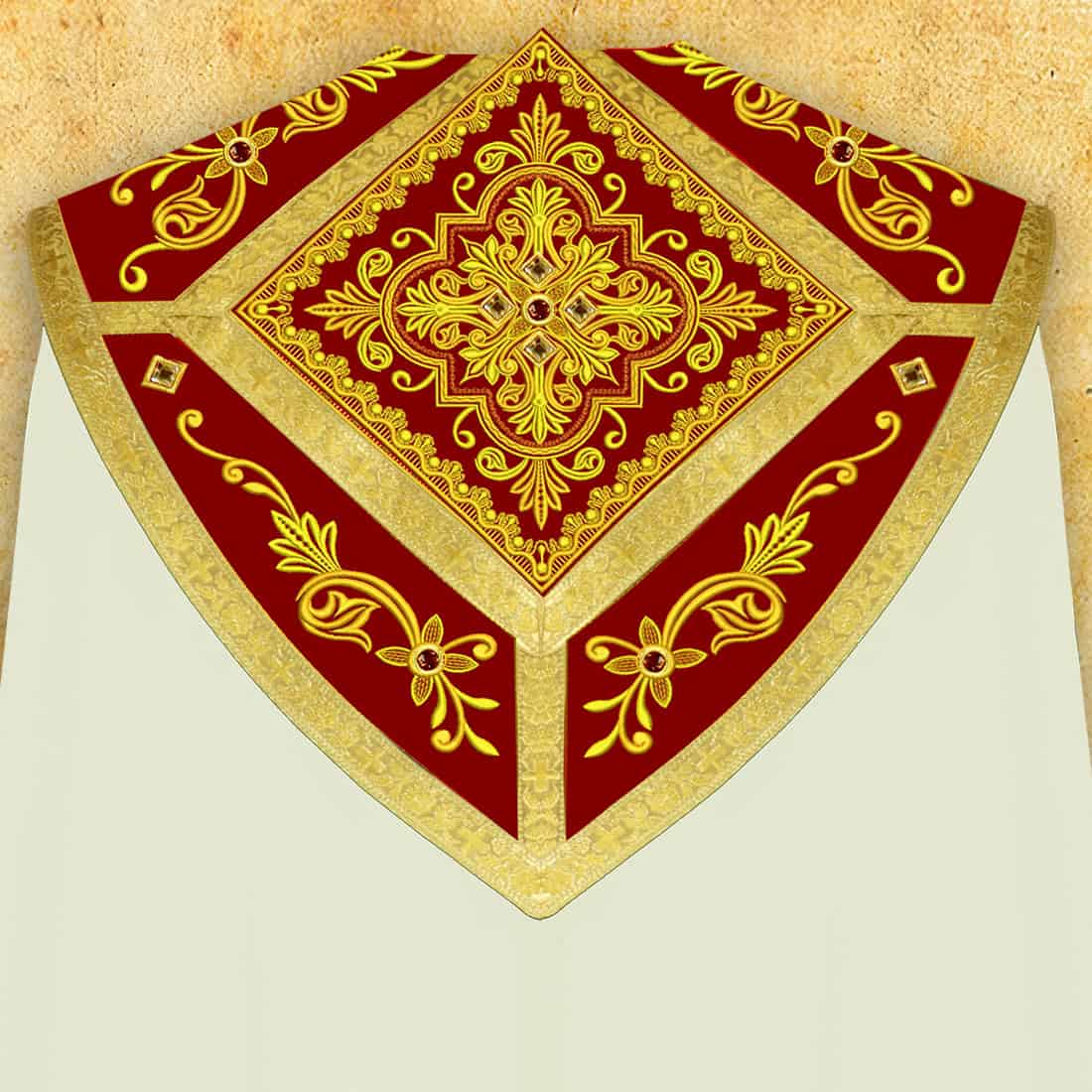 Liturgical cape made of high-quality satin fabric, combining natural and synthetic fibers.Soft, elegant, and comfortable to wear, perfect for solemn celebrations. The collar, braids, and stole made of “Satinowool” fabric are decorated with rich embroidery with gold thread and hand-applied stones, which gives the cope a unique, luxurious character.nThe whole is complemented by Italian trimmings in the color of old gold.The set includes a matching inner stole.One size fits all.