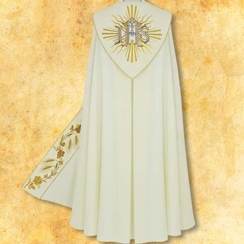 Embroidered liturgical cape made of high-quality satin fabric, combining natural and synthetic fibers.The material is soft, delicate, and drapes elegantly during use, ensuring complete comfort.