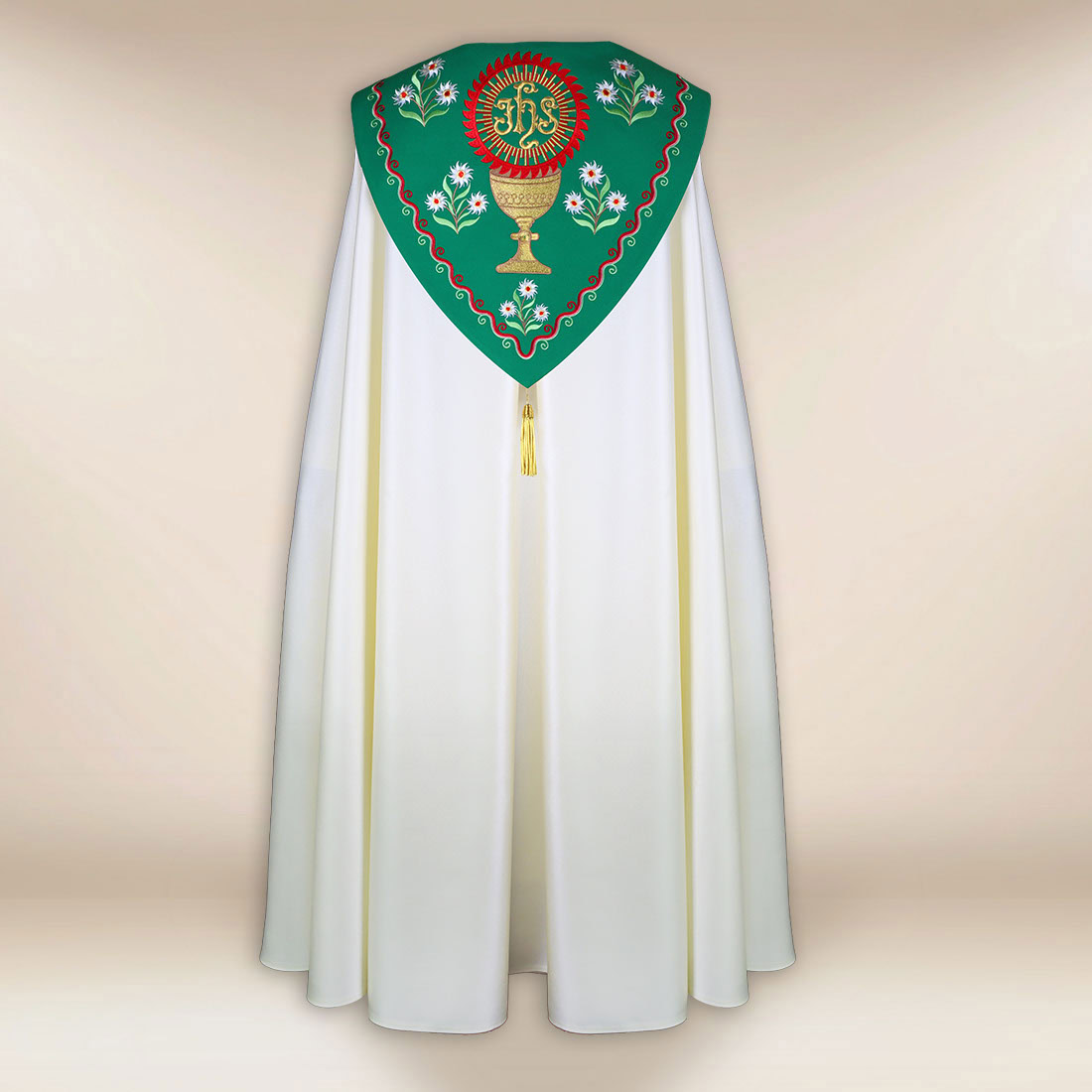 The classic cut of the cope ensures that the vestment drapes properly during ceremonies, and the careful finish emphasises its durability and representative character. The cope is suitable for both everyday pastoral ministry and solemn celebrations, expressing respect for tradition, beauty and liturgical harmony.