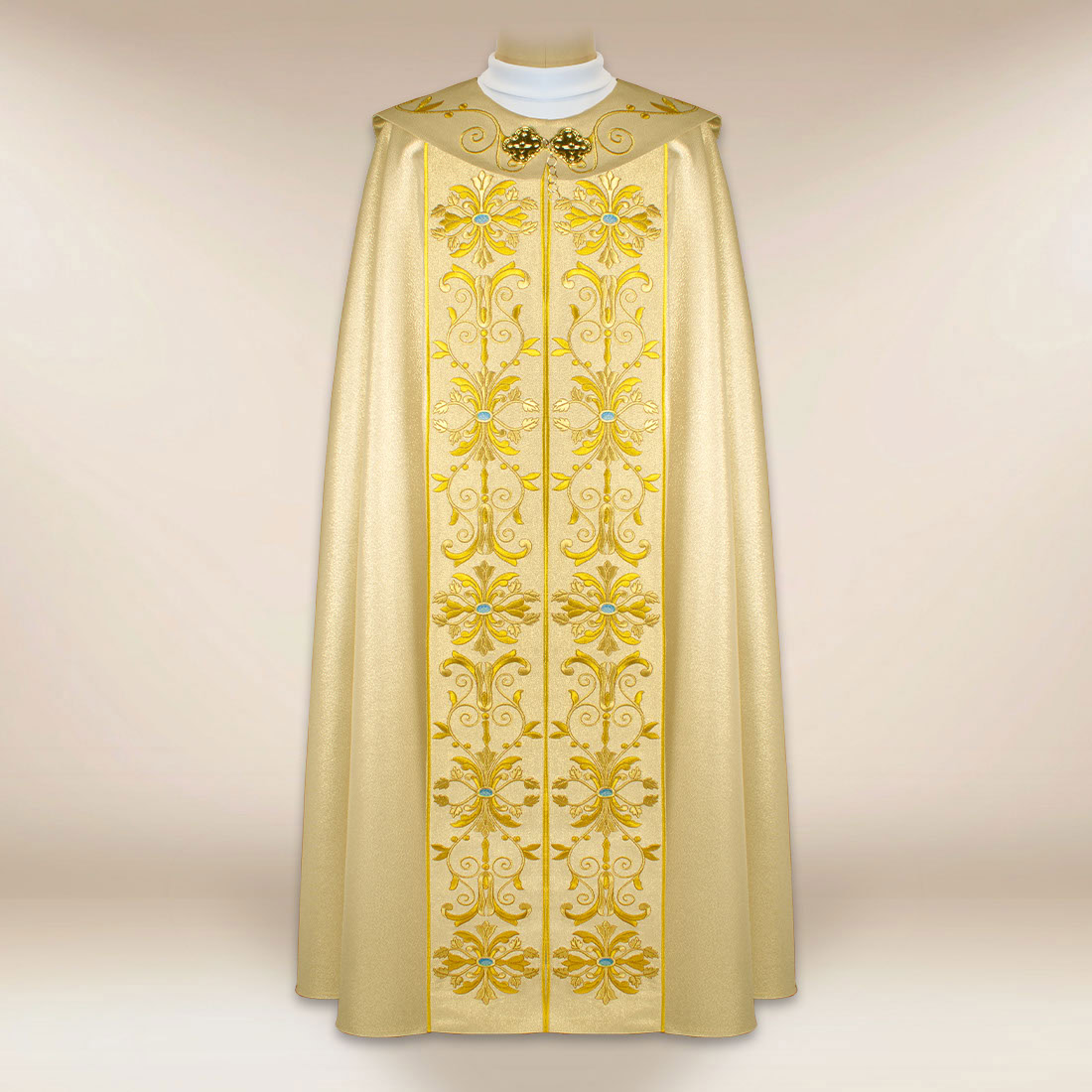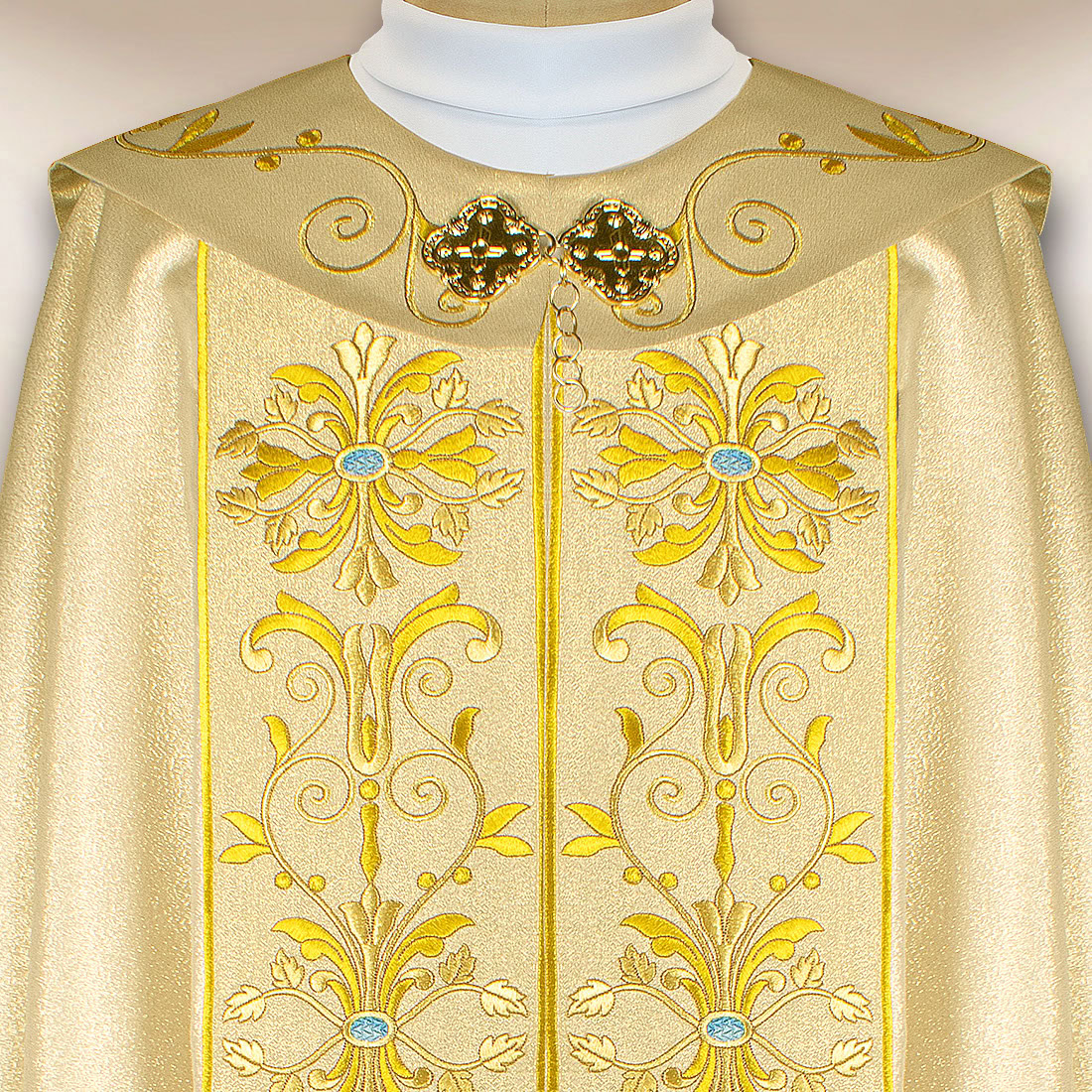 The cope is made of elegant fabric “Golden Mist,” distinguished by its lightness, softness, and delicate sheen. The material drapes beautifully during movement, creating a natural line of the garment and emphasizing its ceremonial character. At the same time, it remains comfortable to wear, which is particularly important during long processions and solemn services. The high quality of workmanship and careful finishing of all elements ensure durability and aesthetics preserved for many years.