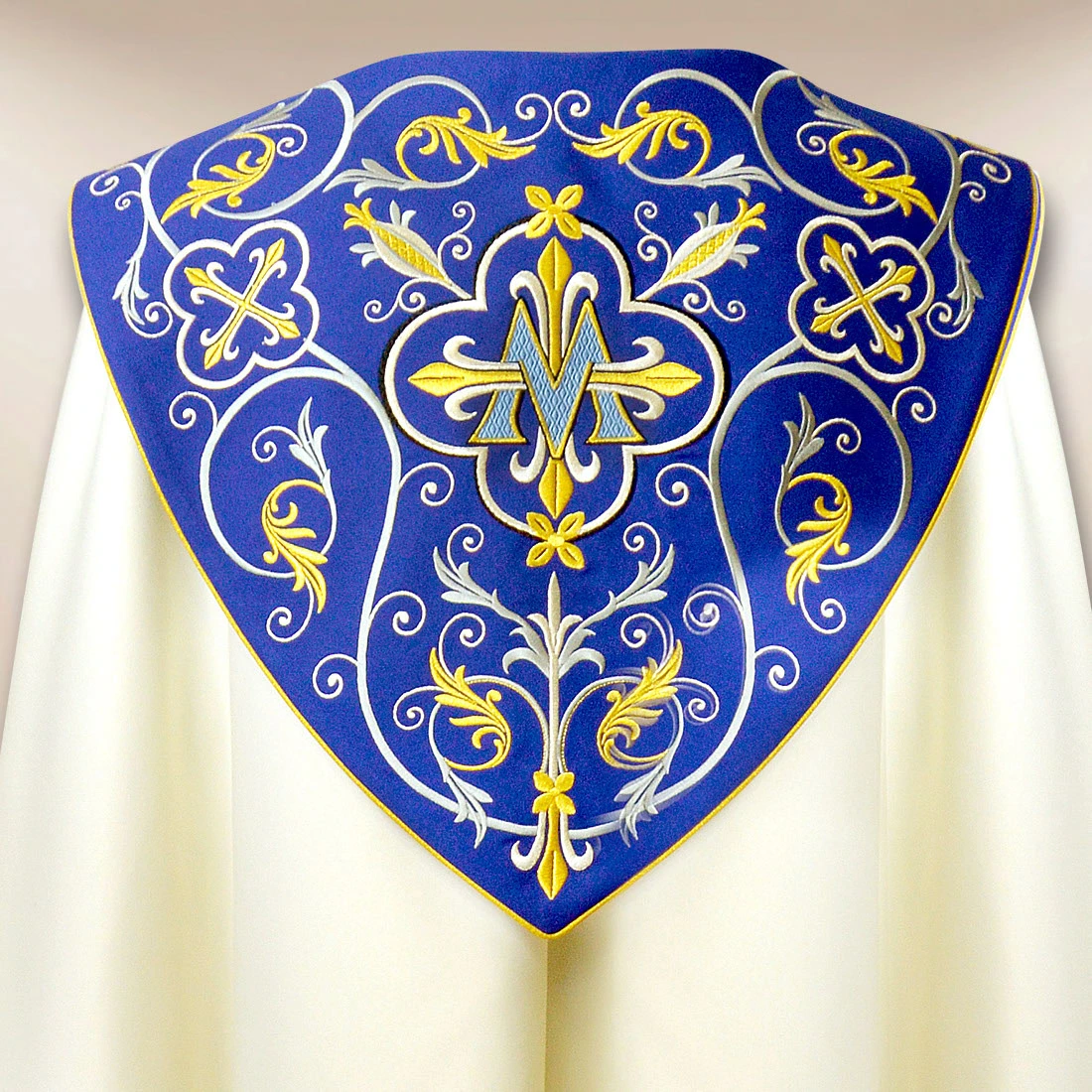 The entire piece is adorned with a carefully crafted Marian pattern — discreet yet expressive, designed with balanced symbolism in mind. The collar and galloons are prepared in a blue tone and enriched with embellishments made with gold and silver thread. The embroidery creates a rhythmic composition that guides the eye along the lines of the garment, highlighting its liturgical function. The ornaments are arranged to maintain a balance between decorativeness and elegance, without ostentation, but with an emphasis on the sacred character.