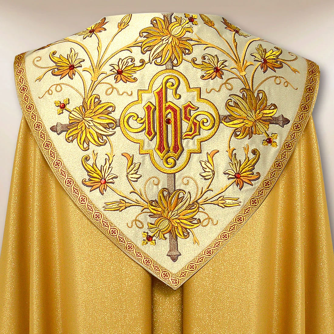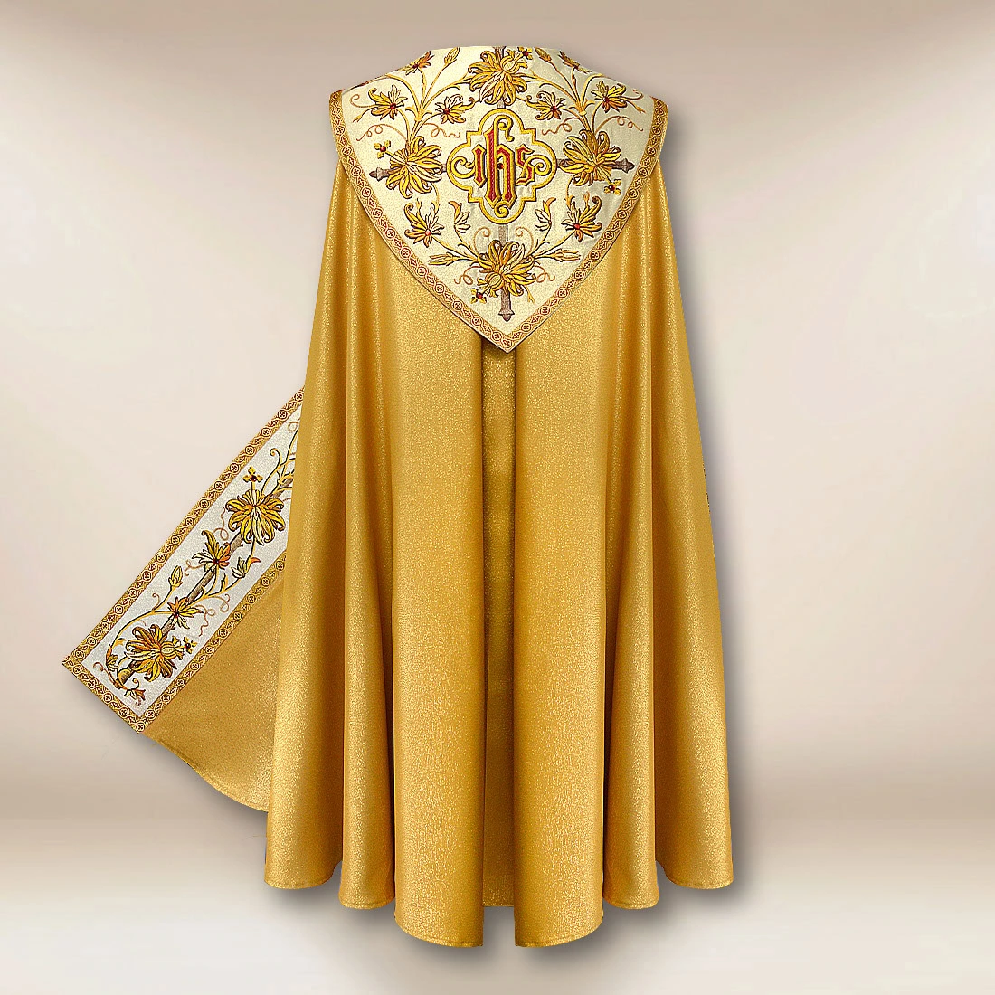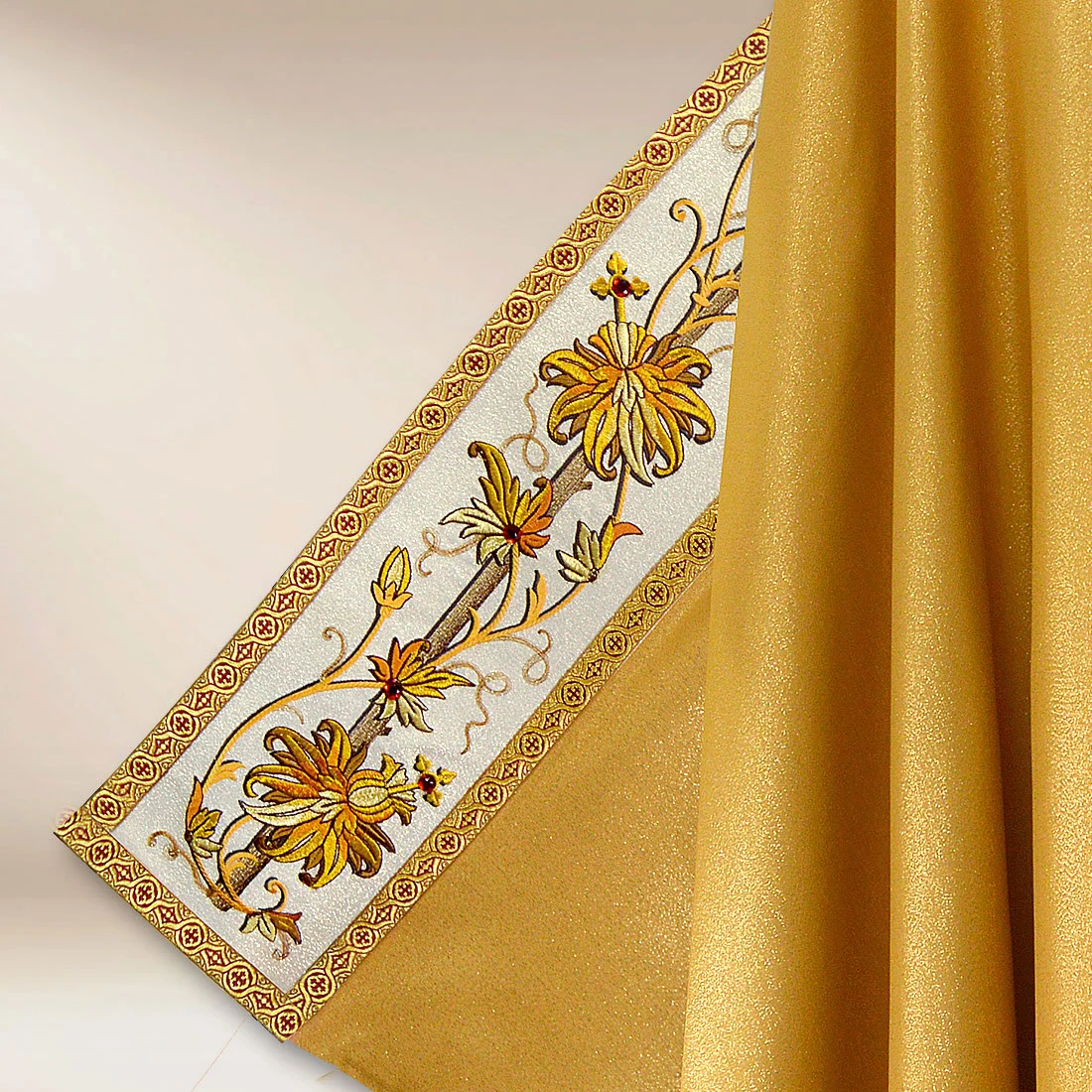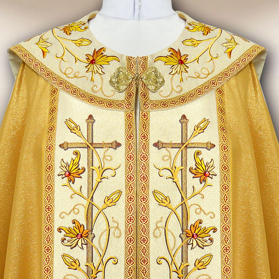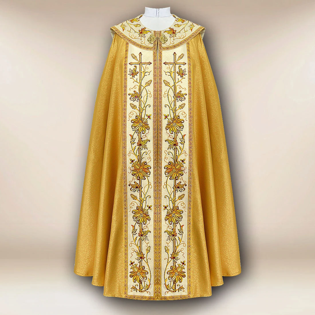 Embroidered gold cope “Classico Gold” is a vestment designed for solemn celebrations, during which the liturgy takes on a special character. Its elegant nature is highlighted by the use of Damastic Gold fabric with a noble, golden sheen that beautifully reflects light and gives the vestment a dignified expression. On the collar and side panel, there is rich embroidery with floral motifs, crafted with attention to every detail. The composition is further enhanced by hand-set stones, which introduce subtle yet striking decoration.
