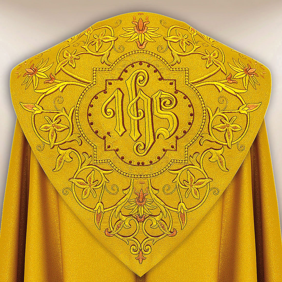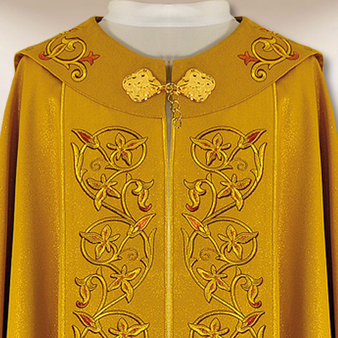 An elegant liturgical cape in gold is made of high-quality brocade fabric in the shade of “Old Gold”. The liturgical cape embroidered with gold adds charm to any ceremony. The fabric is light, airy, and pleasant to the touch, ensuring comfort when worn and an elegant, festive look.gt;comfort when worn and an elegant, solemn appearance.<br data-start="985" data-end="988" The subtle sheen of the fabric emphasizes the dignity of liturgical celebrations, while harmoniously complementing other vestments and elements in golden colors.n