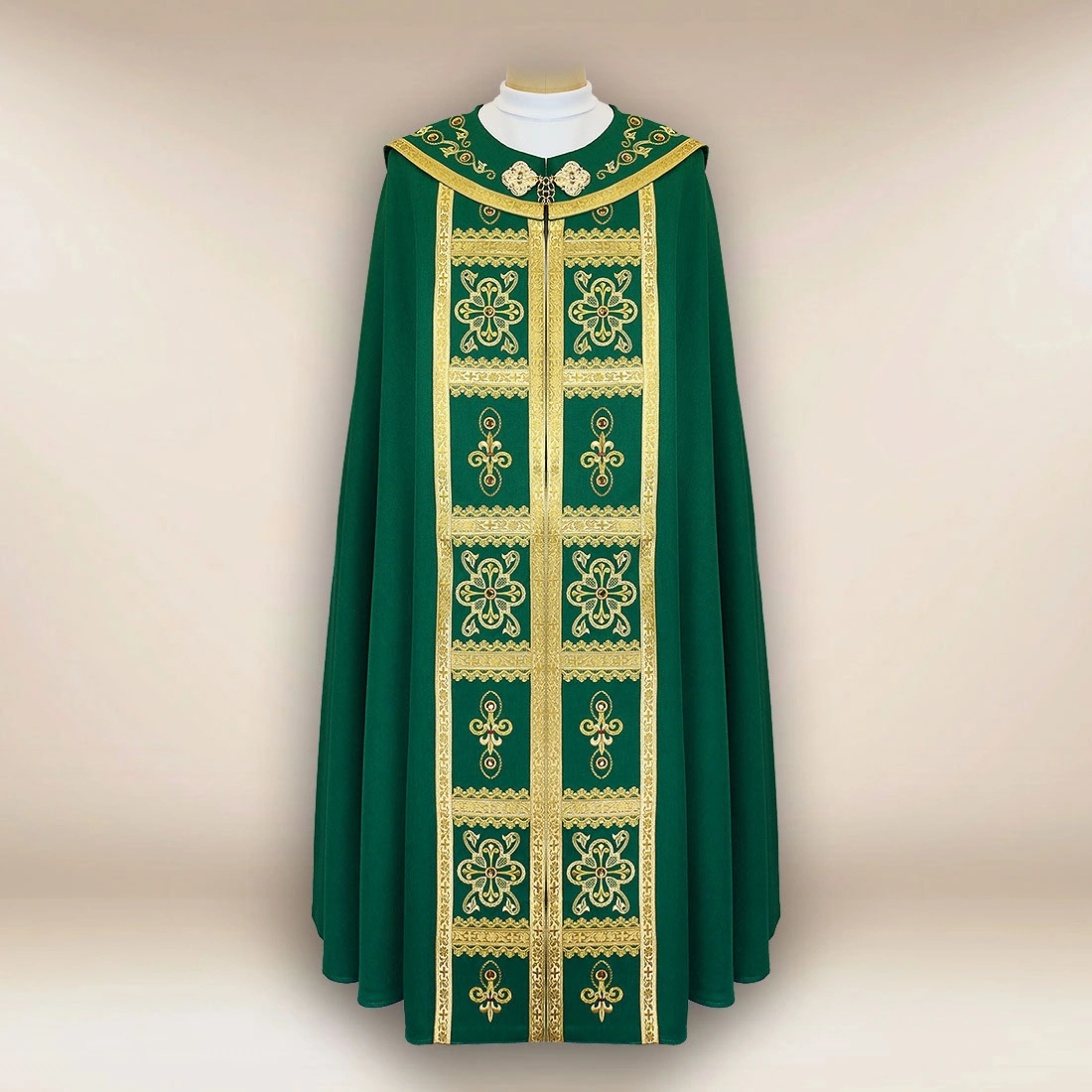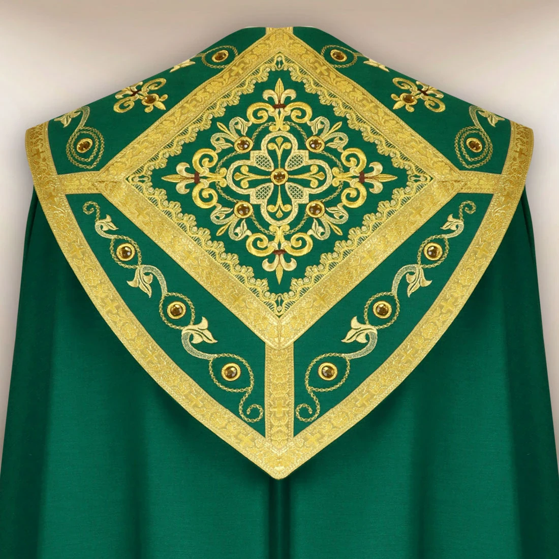 The whole is complemented by Italian braided trimmings in the color of old gold, which harmoniously blend with the green fabric, emphasizing the prestigious and liturgical character of the cope. The embroidered “Brillante-Verde” cope perfectly matches these decorations, creating a coherent image of ceremonial vestments.