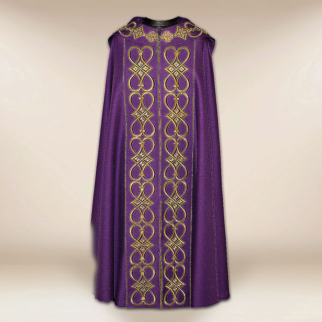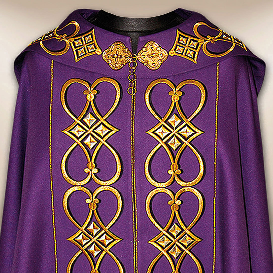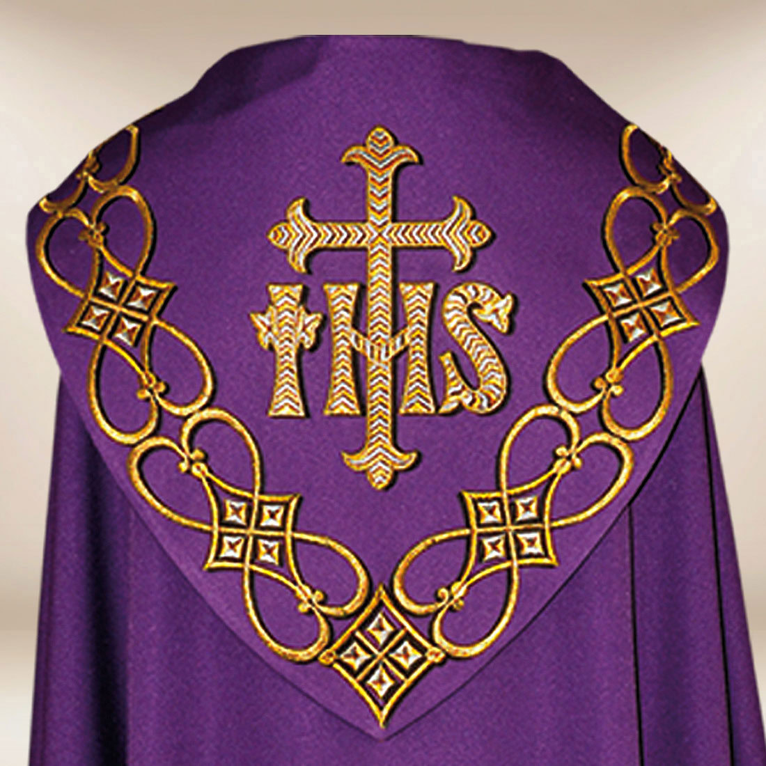 Embroidered purple cope IHS is an excellent choice for parishes seeking a cope of exceptional elegance, symbolism, and durability of execution.