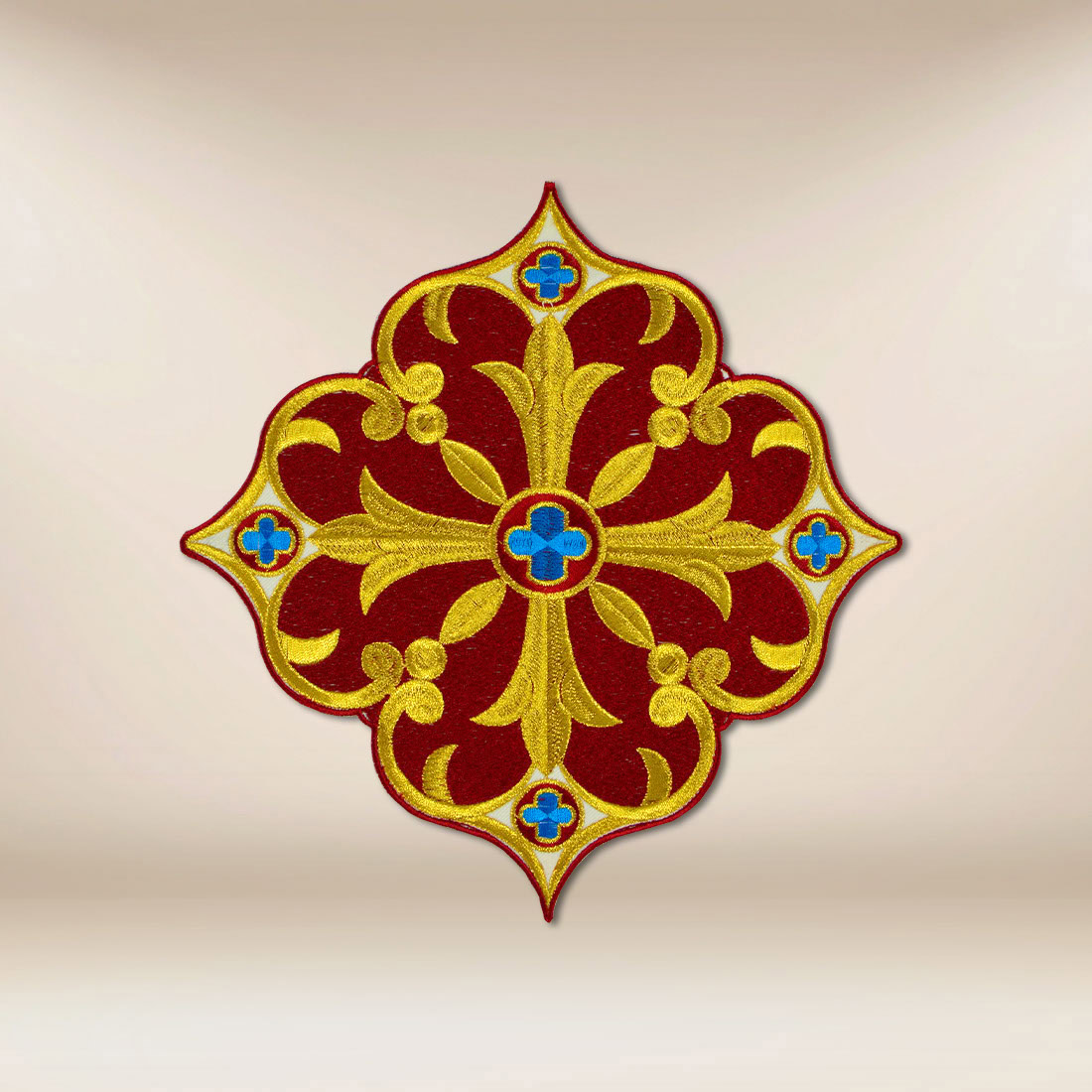 Embroidered Application Cross is a vivid sign of the Christian faith, presented in a rich and harmonious decorative form. The cross, being the central symbol of salvation and the sacrifice of Christ, is depicted here in an elaborate, ornamental arrangement that emphasizes its solemn and representative character. The carefully designed composition draws attention while maintaining liturgical gravity.