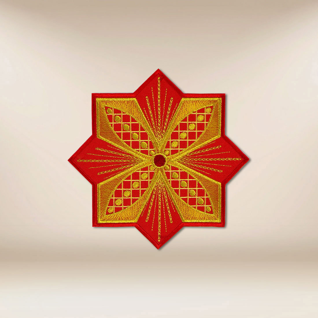 Embroidered cross application is a vivid and deeply symbolic decorative element intended for use in liturgical space. The motif of the cross has remained a central sign of Christianity for centuries – a symbol of sacrifice, salvation, and hope. Its presence on priestly garments and church textiles emphasizes the sacred nature of the celebration and focuses the attention of the faithful on the essence of the liturgy.