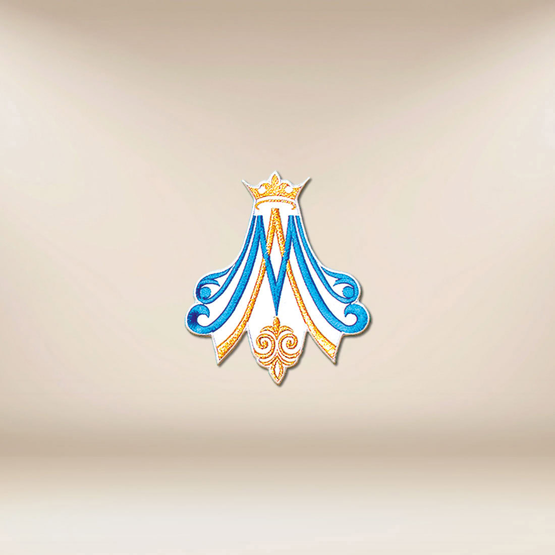 The embroidered Marian application M has been designed with a focus on serene elegance and a clear, readable message. The first glance at the embroidered application “M” in blue reveals a beautiful composition: a stylized letter M, gently unfolding like the mantle of Mary, crowned and subtly highlighted with golden lines.