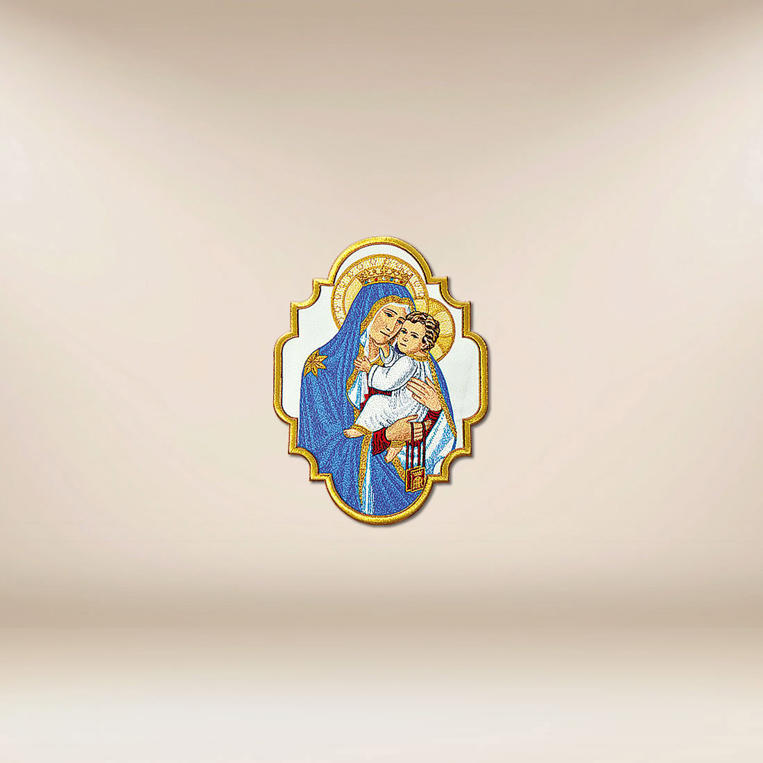 Embroidered Application Mother with Child has been designed as a warm and theologically profound representation of one of the most important scenes in Christian iconography. The image of Mary embracing the Child Jesus not only reveals Her maternal love but also Her role as the Mother of God and Guardian of the Church. The subtle gesture of embracing and the serene gaze of the figures introduce an atmosphere of silence, trust, and spiritual safety into the liturgy.