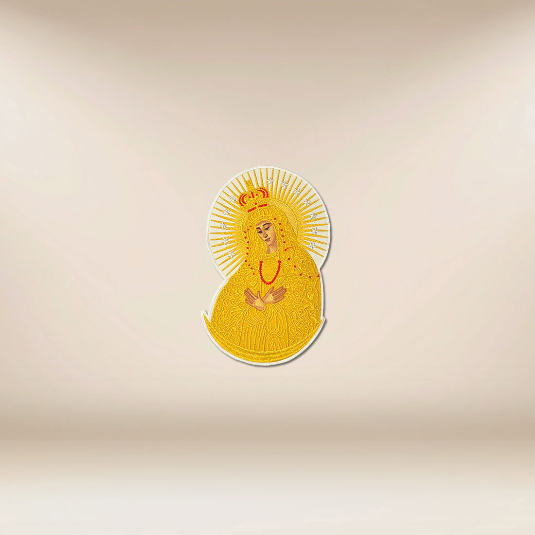The symbolism of the application is based on the rich tradition of devotion to Our Lady of Ostra Brama, venerated as the Guardian and Intercessor of the faithful. The radiant halo and crown emphasize Her royal dignity, while the subtle details of the garments and the embroidery ornamentation give the whole a harmonious, sacred character. The composition has been designed in a dignified manner, suitable for both solemn celebrations and daily liturgy.