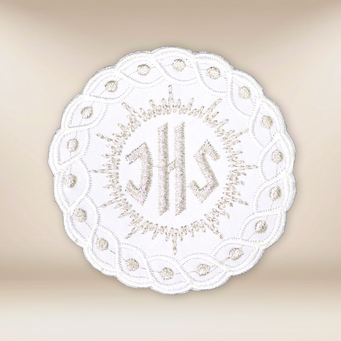 The design of the application is based on a harmonious, round shape of the host, surrounded by a delicate, radiant ornament. The centrally placed IHS symbol gives the whole a distinct eucharistic character while maintaining moderation and liturgical solemnity. The composition has been designed to subtly complement the communion attire, without dominating its simplicity and clear message.