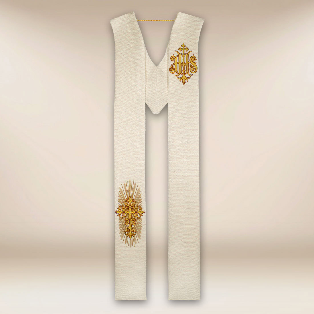 An elegant ecru-coloured embroidered stole interwoven with gold thread. Decorated with embroidered IHS symbols and a cross, which emphasise its sacred and liturgical character. High-quality fabric and careful workmanship guarantee durability and an aesthetic appearance. Ideal for solemn liturgical celebrations.