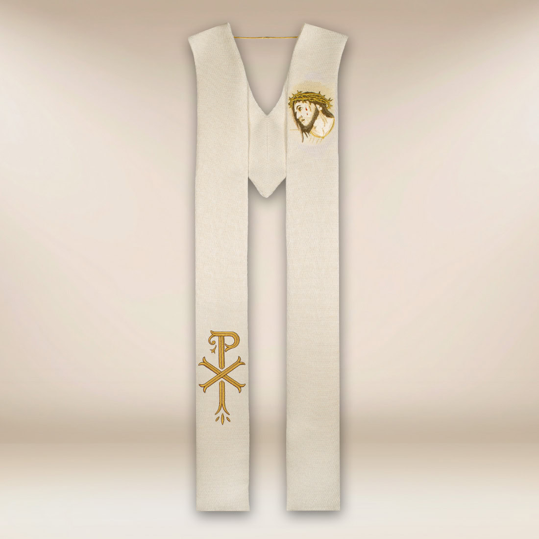 An elegant ecru-coloured embroidered stole interwoven with gold thread. Decorated with embroidery depicting Jesus wearing a crown of thorns and the PAX symbol, emphasising the spiritual dimension of Christ’s peace. High-quality fabric and careful workmanship ensure durability and an aesthetic appearance. An excellent choice for solemn liturgical celebrations.