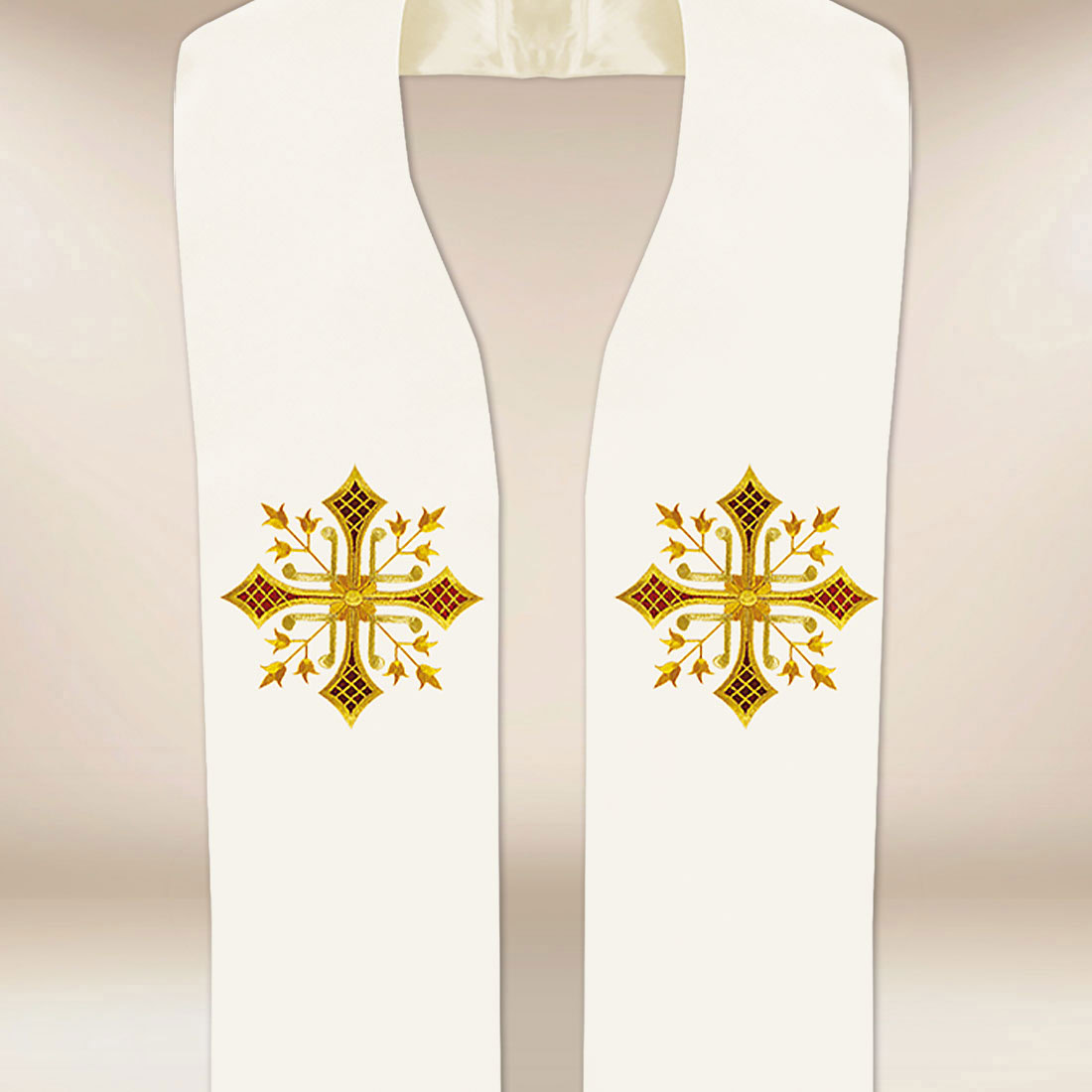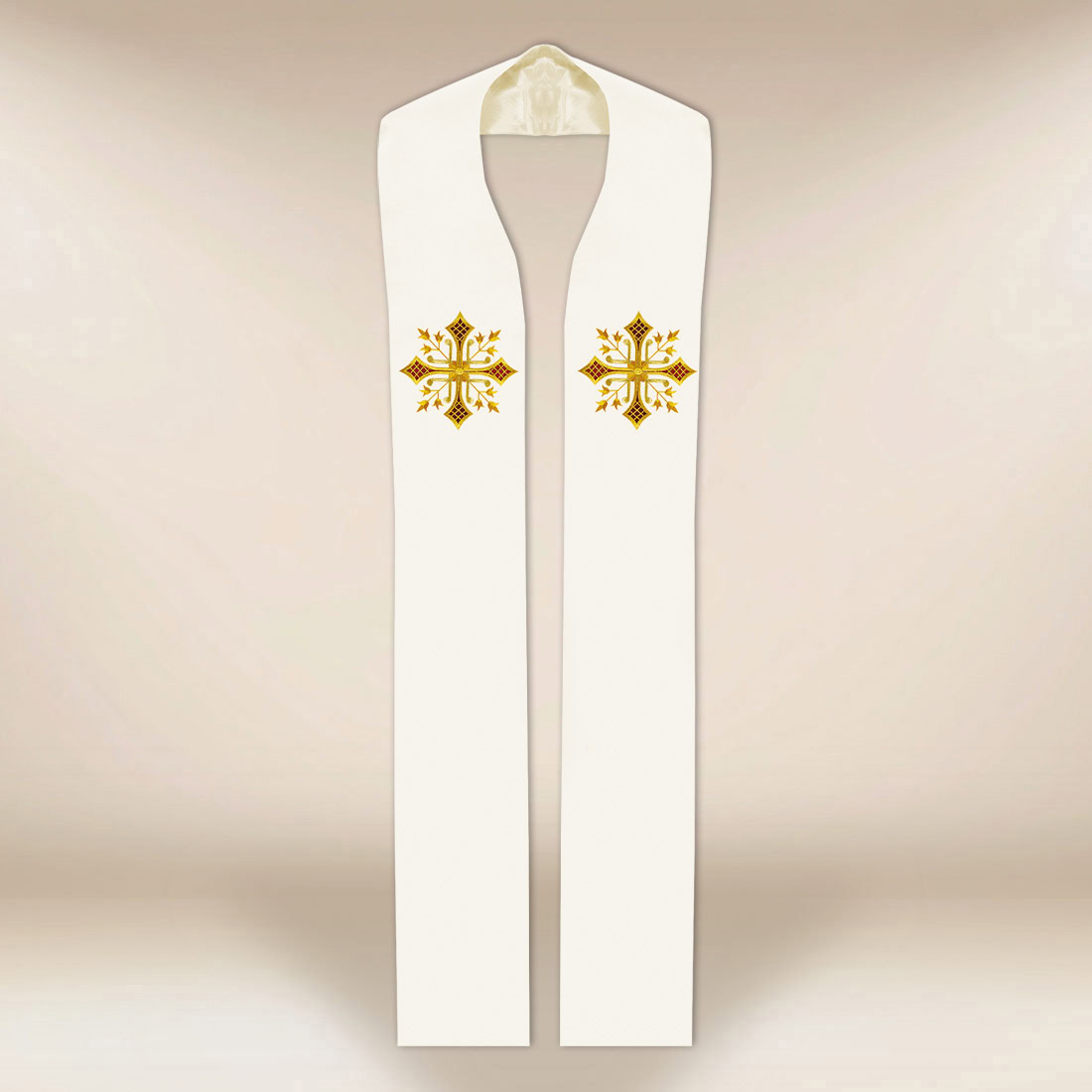 An elegant ecru embroidered liturgical stole with a cross motif is a unique element of priestly vestments, combining spiritual symbolism with classic beauty and the highest quality workmanship. Made of high-quality fabric of exceptional softness and delicacy, it ensures comfort, lightness, and freedom of movement during every celebration.gt;high-quality fabric of extraordinary softness and delicacy, it ensures comfort, lightness, and freedom of movement during every liturgical celebration.