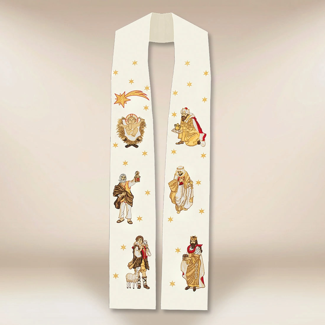 Embroidered Stole for Christmas “Bethlehem” sepia is an exceptional offering designed for priests celebrating the liturgy during the Christmas season, Midnight Mass, and festive parish services. The vestment is adorned with rich, narrative embroidery depicting the Nativity scene, including the Infant Jesus in the manger, the Bethlehem star, shepherds, and the Three Kings. Each figure has been crafted with attention to liturgical aesthetics and subtle symbolism, giving this stole a unique character.