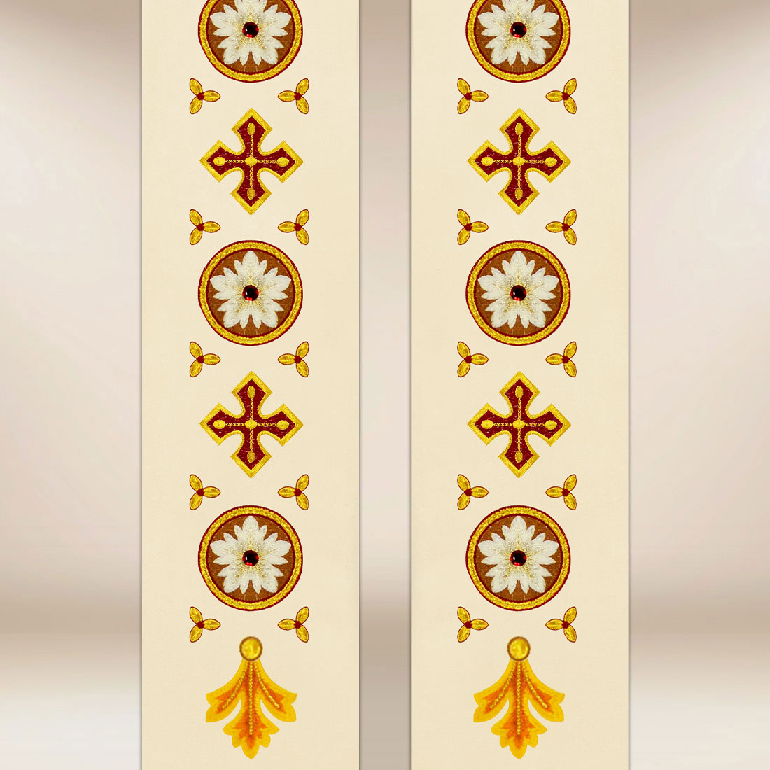 The set includes two laser-cut collars, allowing for perfect fitting of the stole and an aesthetic finish to the whole. The universal size ensures that the stole is suitable for every priest, providing comfort of wear and proportional arrangement on the silhouette.
