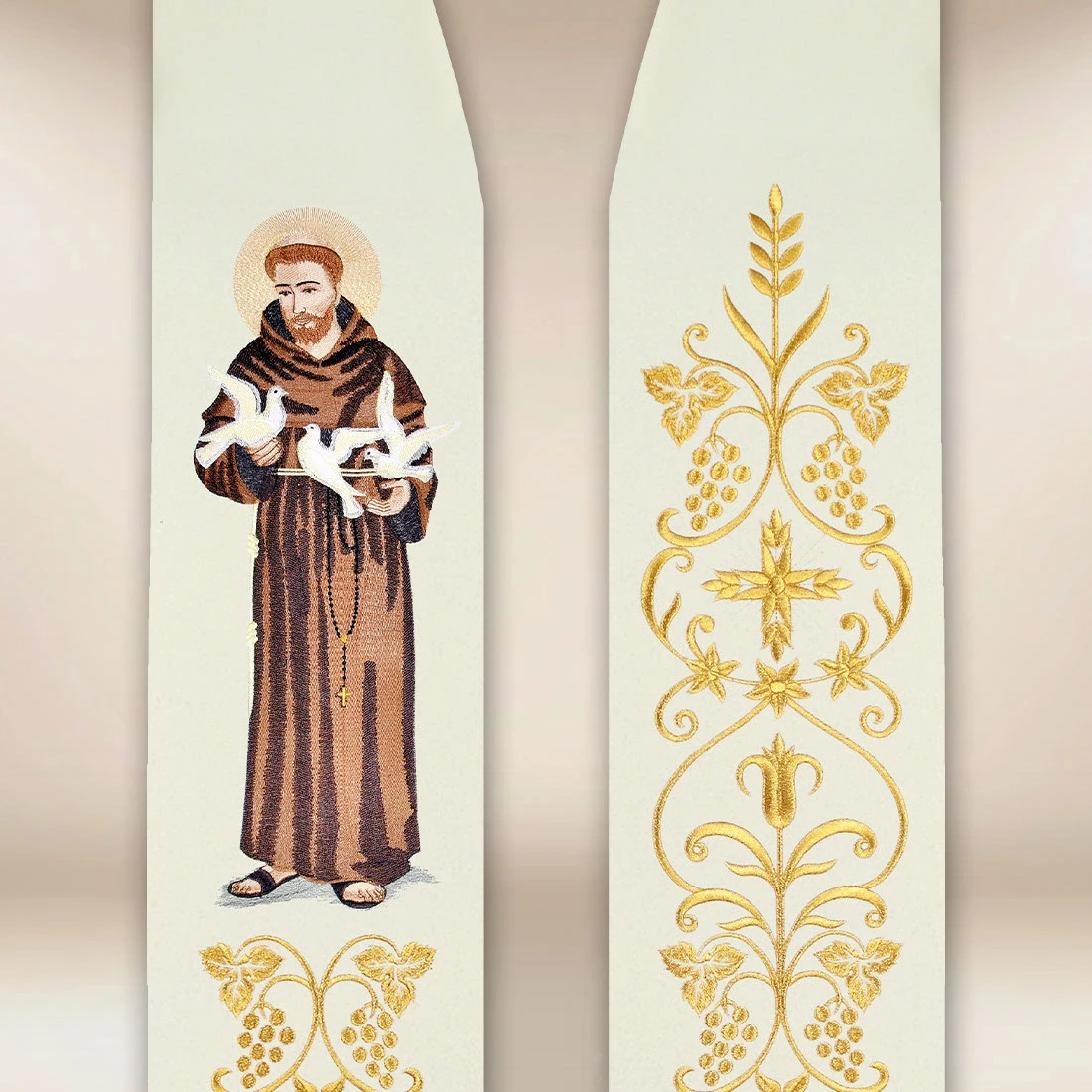 Embroidered stole featuring St. Francis in ecru color, made from high-quality fabric that is a blend of durable fibers.