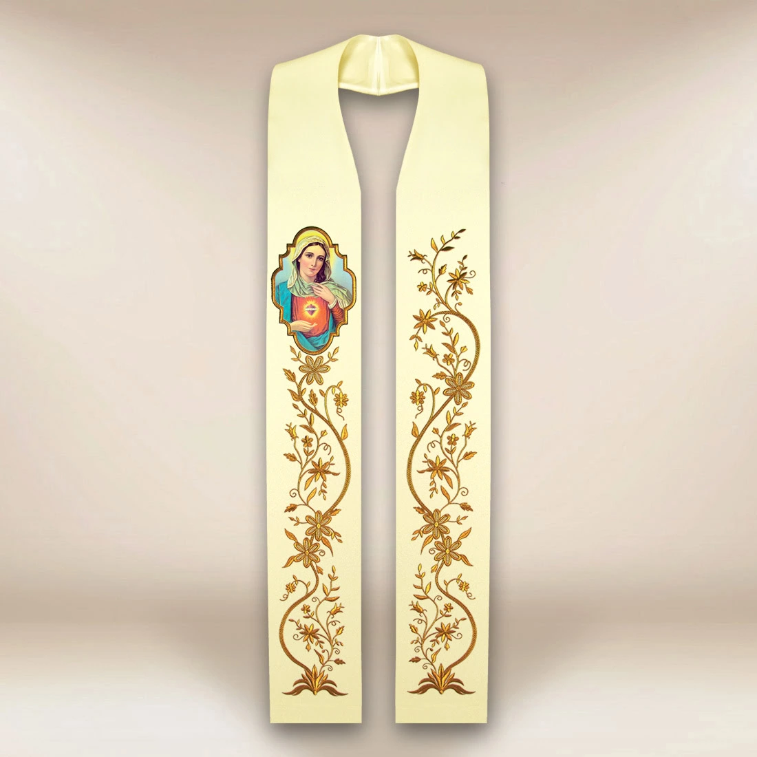Stole with the Image of the Heart of Mary features a photographic image of the Blessed Virgin Mary in a beautiful, classic color scheme.