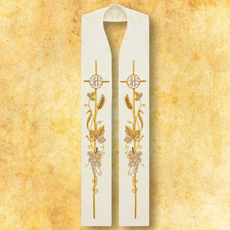 Priestly liturgical stole “IHS, Ears of Corn and Grapes”Color: ecruLength: 120 cm (+ – 2 cm)The price of each stole includes 2 laser-cut collars