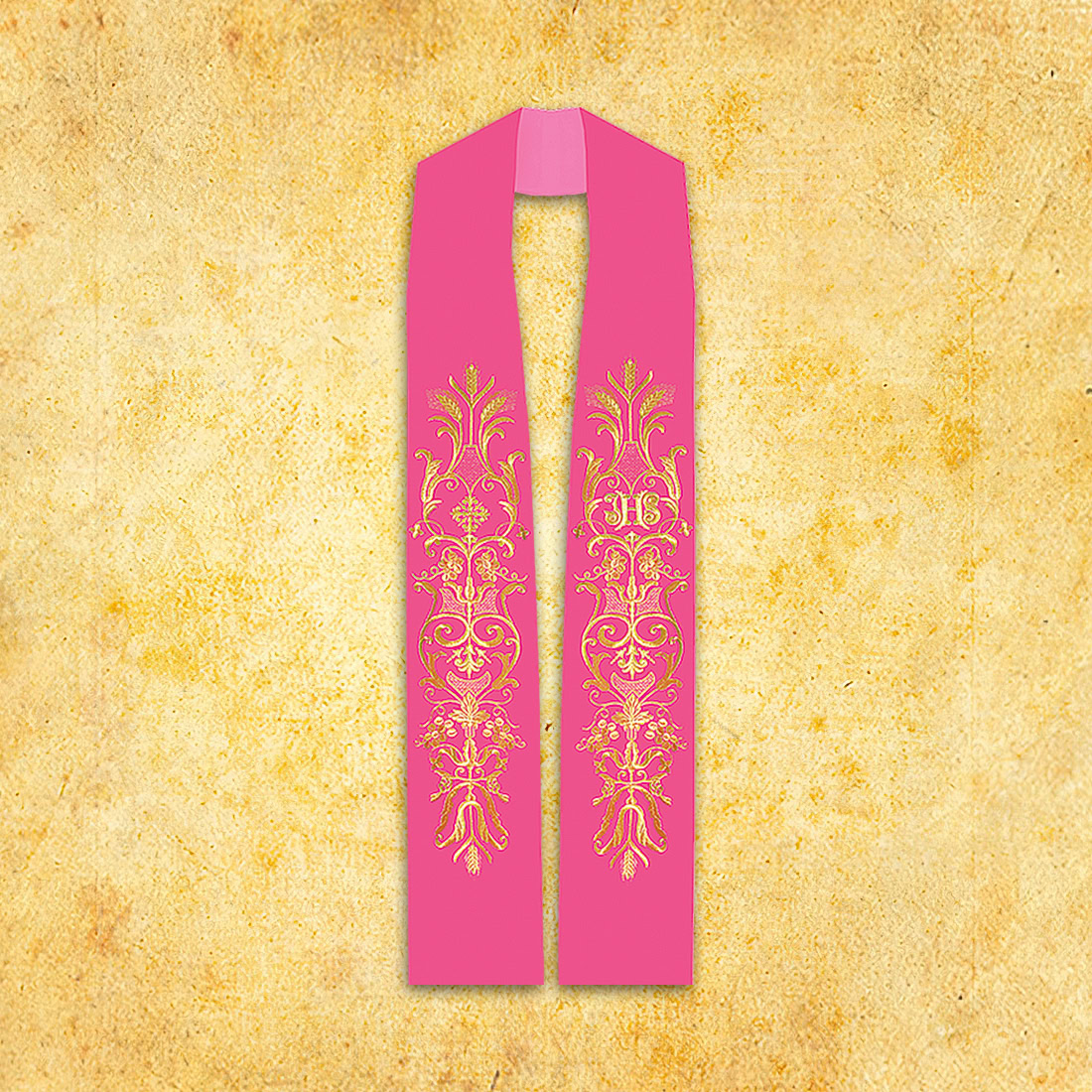 Embroidered liturgical stole in pink, made of high-quality fabric.Lightweight, soft and pleasant to the touch, it ensures comfort and perfect draping during celebrations.Its classic cut and elegant design make it suitable for both chasubles and copes.The color pink is used in the liturgy during the Third Sunday of Advent (Gaudete) and the Fourth Sunday of Lent (Laetare).The product is one size fits all, suitable for every priest.Each stole comes with two laser-cut collars.