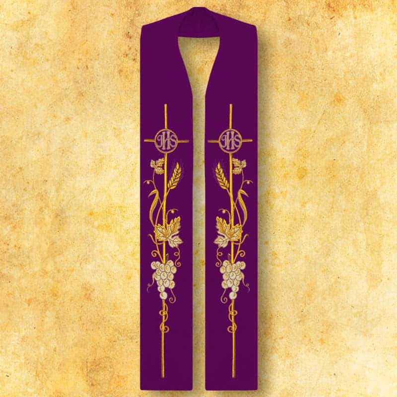 Priestly liturgical stole “IHS, Ears of Corn and Grapes”Length: 120cm (+ – 2cm)The price of each stole includes 2 laser-cut collars