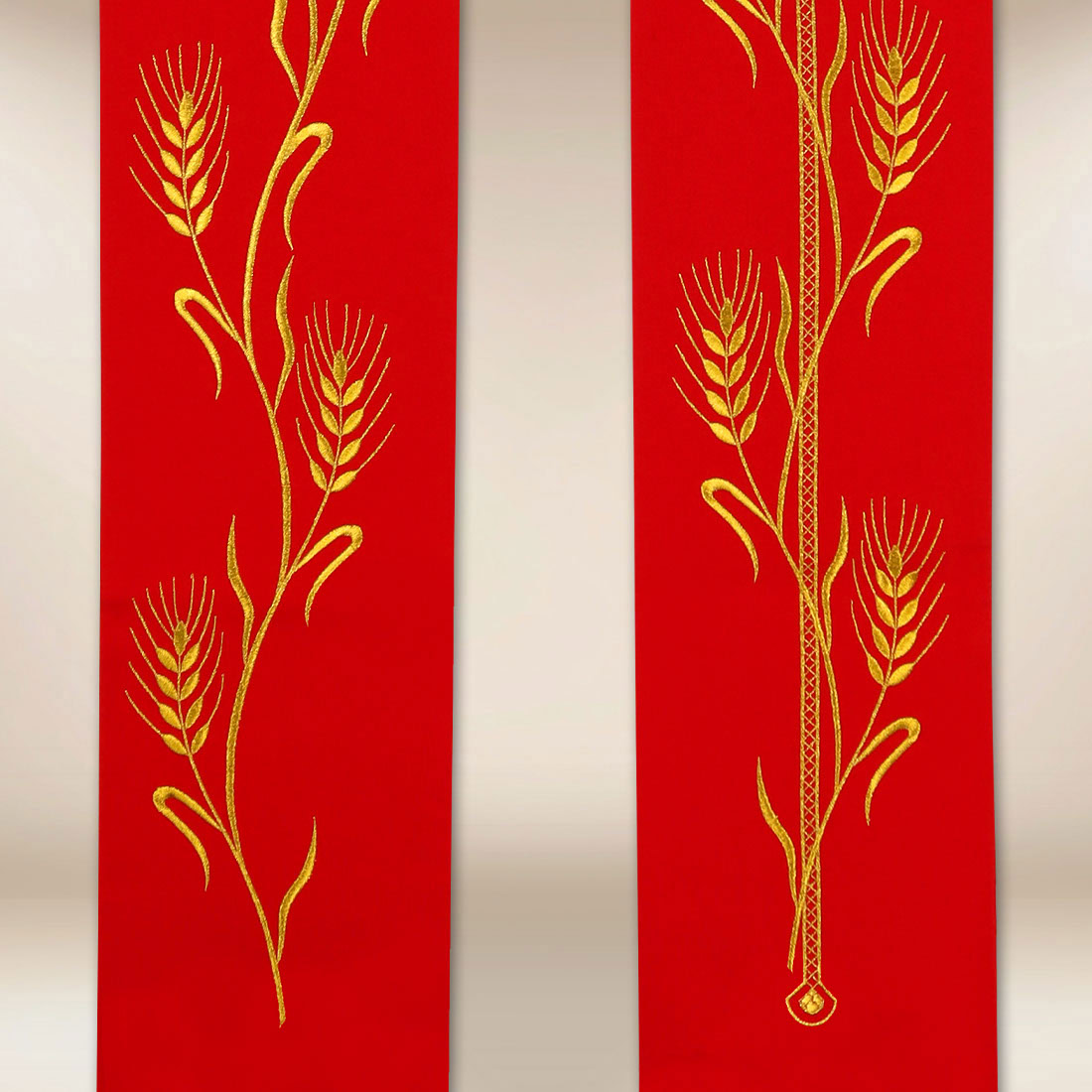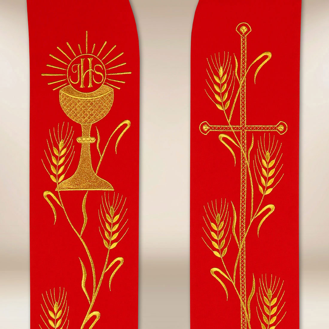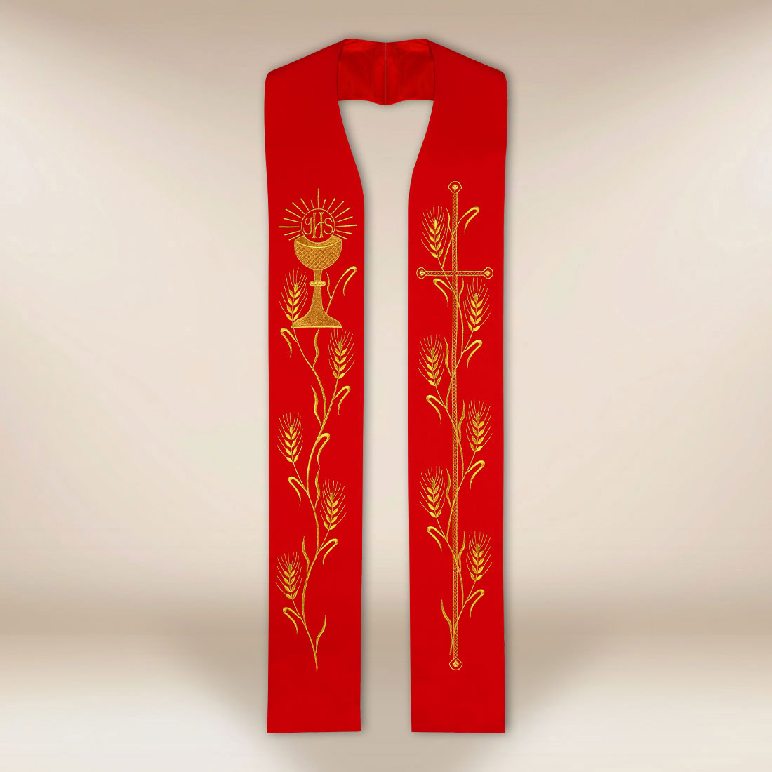 Embroidered stole “Chalice with Wheat Ears” is a noble offering for priests who wish to emphasize the eucharistic character of the liturgy through elegant, clear, and deeply symbolic embroidery. The decoration features a chalice, host, and ears of grain, referencing the sacrament of the Eucharist and the mystery of the transformation of bread and wine into the Body and Blood of Christ. On the second arm of the stole, there is a embroidered cross, which balances the composition and imparts a sacred harmony.