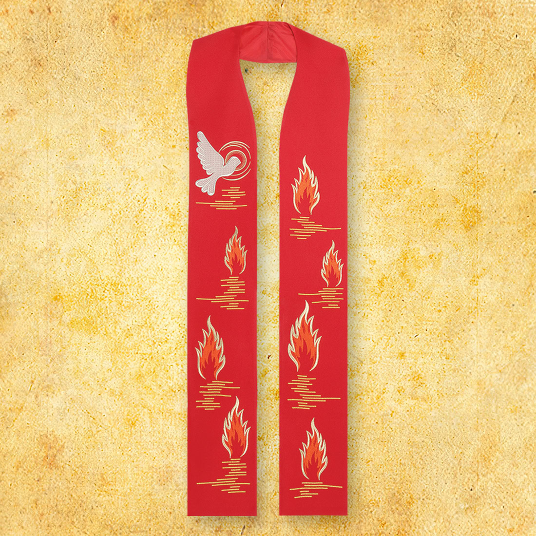 The liturgical stole with an embroidered Holy Spirit motif is made of high-quality fabric and carefully finished with attention to every detail. The material is light, soft, and pleasant to the touch, thanks to which the stole drapes elegantly and ensures comfort during the celebration.nThe classic cut and timeless design make it suitable for various liturgical vestments – chasubles and copes.Perfect for Holy Masses and parish celebrations related to Pentecost.The product is available in a universal size, suitable for every priest.The set also includes 2 laser-cut collars.