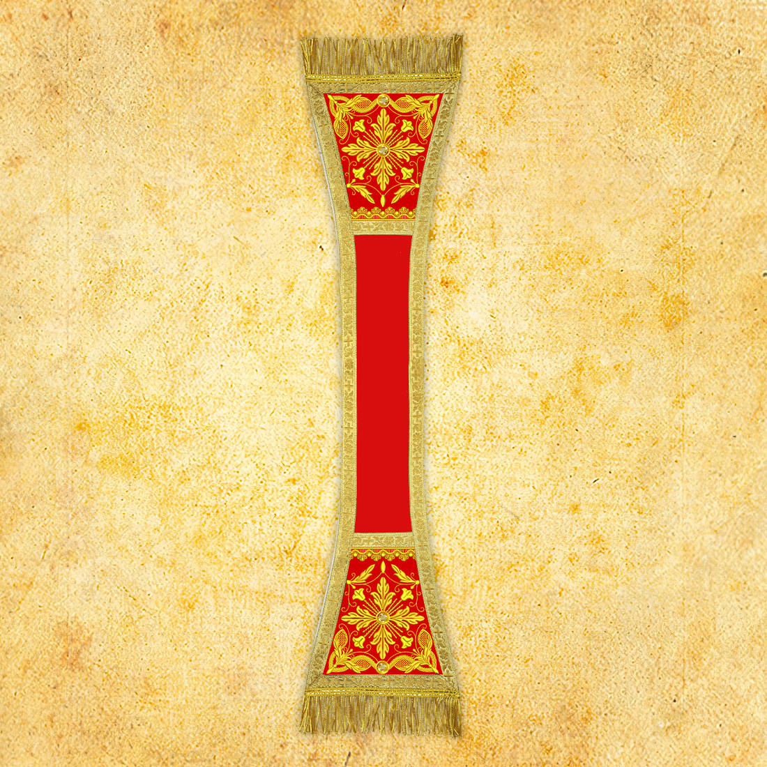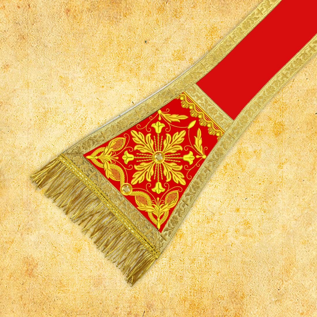 Elegant red liturgical maniple made of “Satinowool” fabric.Decorated with gold embroidery and hand-applied stones, finished with old gold trimmings. />The perfect accessory for solemn celebrations and priestly vestments.