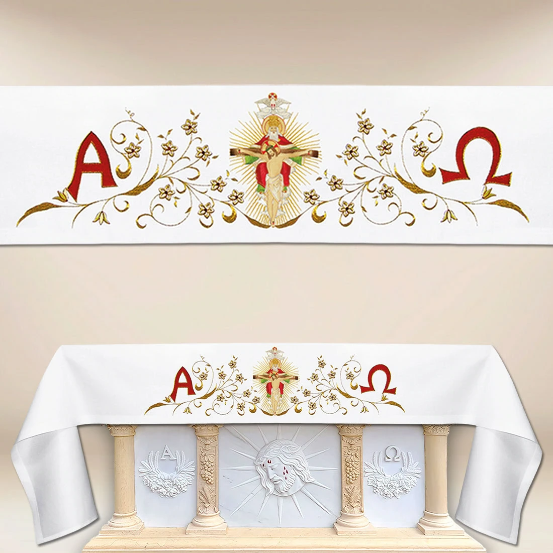The beautifully crafted golden embroidered motif harmonizes perfectly with the image of the Holy Trinity, making this embroidered tablecloth one of the most beautiful products in our range of liturgical altar tablecloths. The Holy Trinity embroidery harmonizes perfectly with the alpha omega symbol.nEmbroidery height: 39 cmEmbroidery length: 112 cm