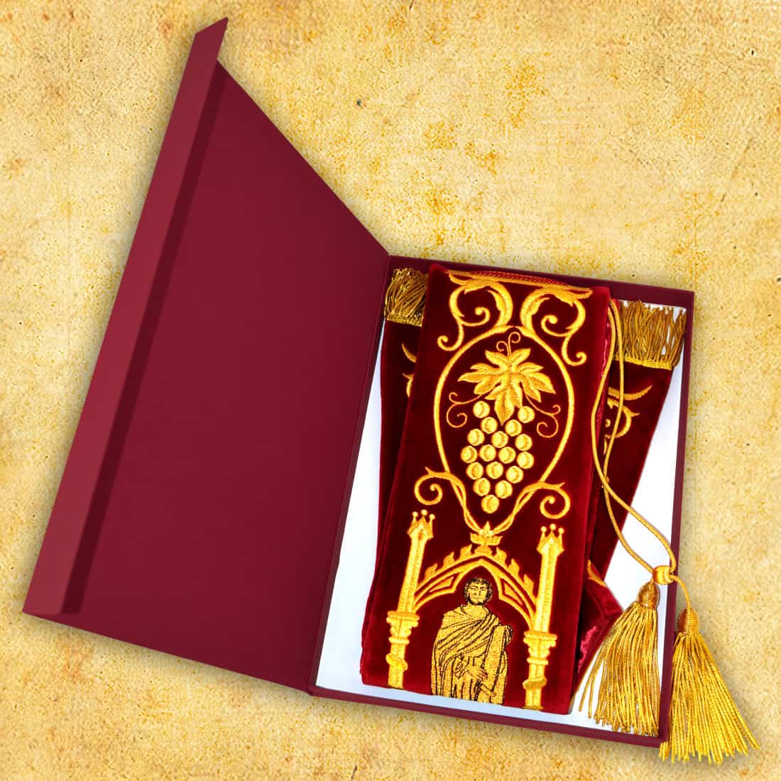 A stylish burgundy box with a magnetic closure, designed for chalices. Made of solid materials and covered with elegant handmade paper. The interior is protected with high-quality white paper, ensuring safe and aesthetic storage.