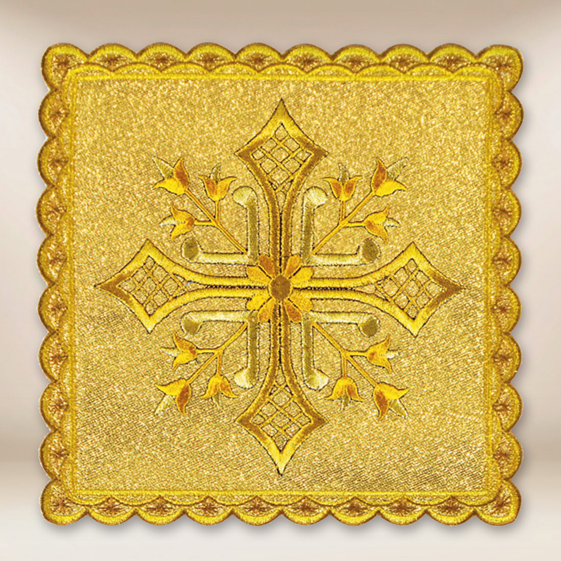 Embroidered Pall in Gold is an elegant element of chalice linen, made from high-quality liturgical fabric in gold. Adorned with exquisite embroidery in the form of a decorative cross with floral details and a central stone, it symbolizes faith, glory, and the spiritual light present in the liturgy.