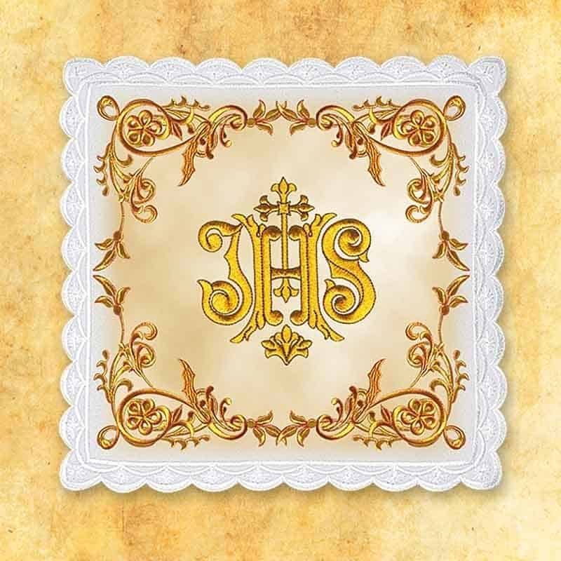 Photo no. 26 is an elegant and dignified liturgical pall, decorated with a golden monogram IHS, symbolizing the name of Jesus Christ. Richly decorated floral ornaments in warm shades of gold and bronze create a harmonious composition that gives the pallet a unique charm and deep sacred meaning. The subtle ecru background emphasizes the nobility of the whole, and the delicate lace trim adds lightness and elegance.lt;/p>