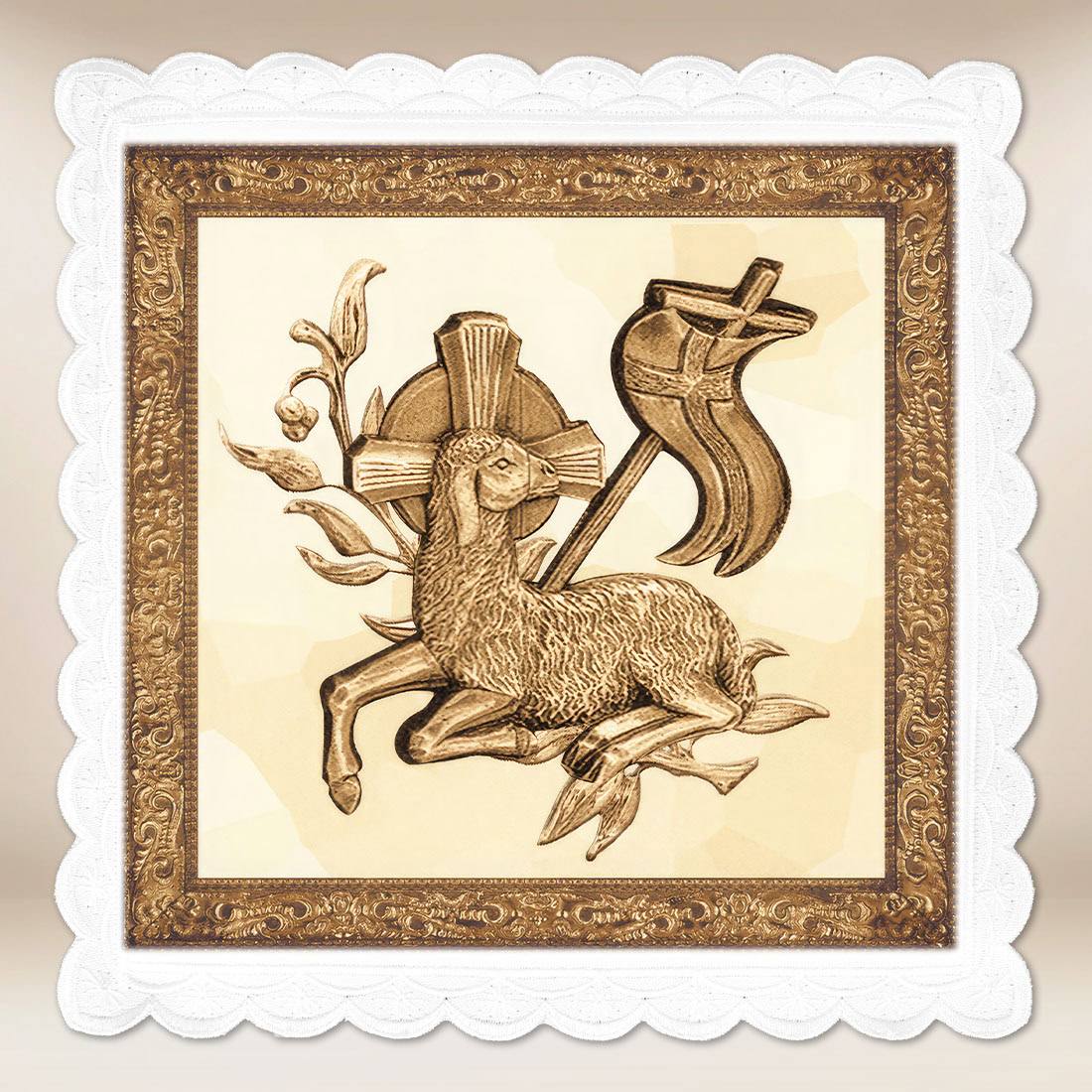 Photographic Pall Lamb of God is an essential element of chalice linen, subtly enriching the celebration of the Eucharist by combining practical use with a profound theological message. It is designed to cover the chalice used during Mass, ensuring aesthetics, order, and dignity in the liturgy.