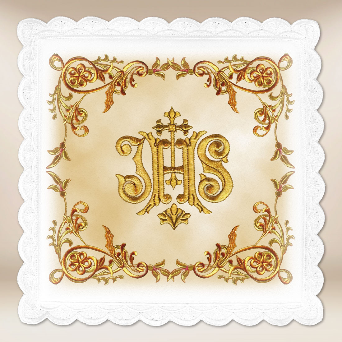 The Photographic Pall is an elegant and dignified liturgical pall, adorned with a golden IHS monogram, symbolizing the name of Jesus Christ. Richly decorated floral ornaments in warm tones of gold and bronze create a harmonious composition, which imparts exceptional charm and deep sacred significance to the pall. The subtle ecru background emphasizes the nobility of the whole, while the delicate lace trim adds lightness and elegance.