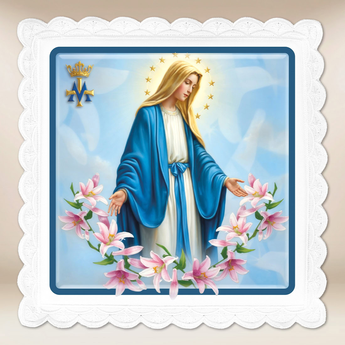 The photographic pall features an image of the Blessed Virgin Mary in a blue cloak, surrounded by a wreath of white lilies – symbols of purity, peace, and spiritual beauty. Mary is depicted with outstretched hands, in a gesture of grace and protection over the faithful. In the upper left corner, there is a golden Marian monogram crowned, which emphasizes the royal and heavenly majesty of the Mother of God. The delicate background in pastel shades of blue creates an atmosphere of prayer and inner peace, making this pall a unique liturgical and decorative element.