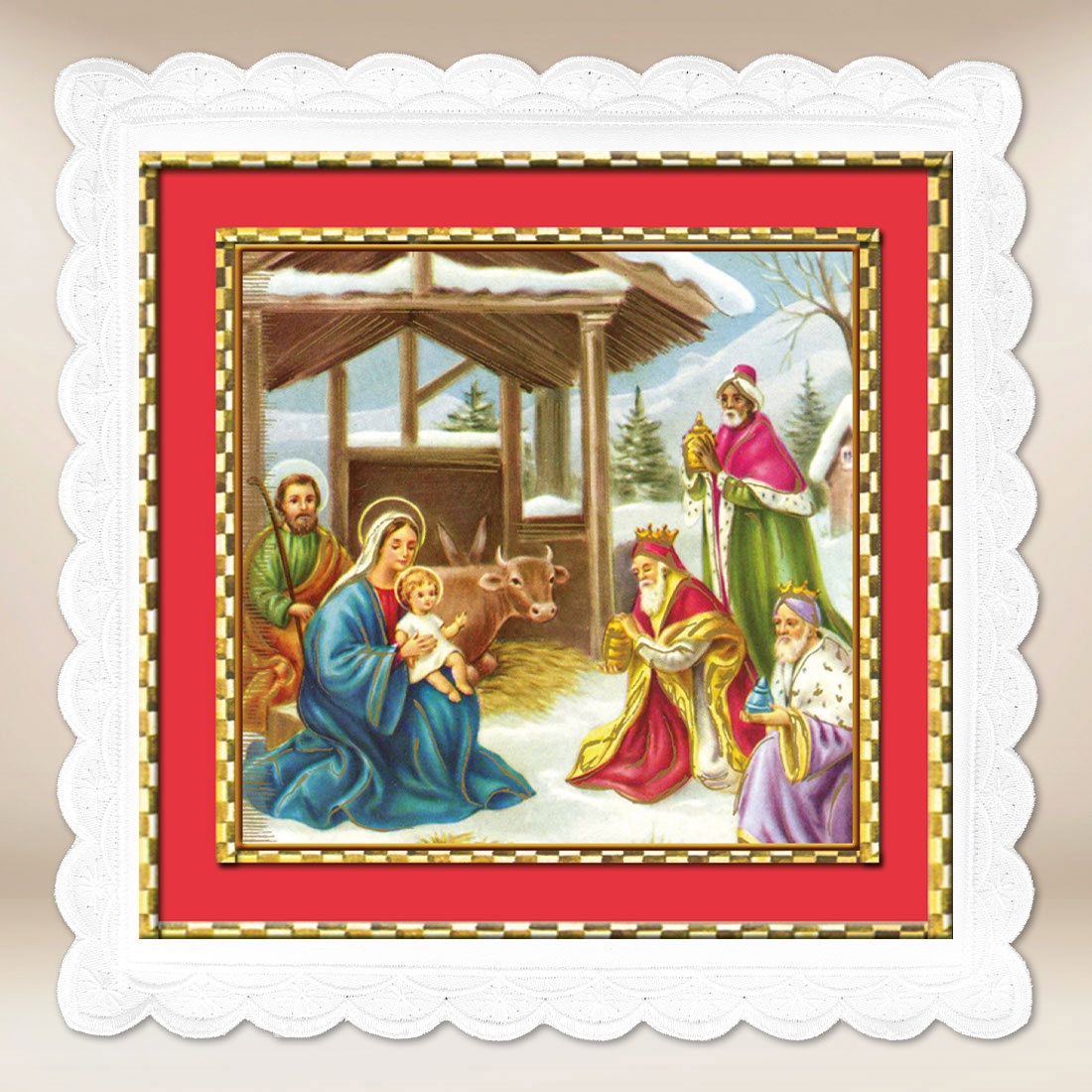 The pall is made of high-quality white liturgical fabric with a satin structure, resistant to deformation and frequent washing. The precise photographic print ensures color durability and excellent detail reproduction. The entire piece is adorned with a delicate lace trim in an ecru shade and an elegant red frame, emphasizing the festive character of the depiction.