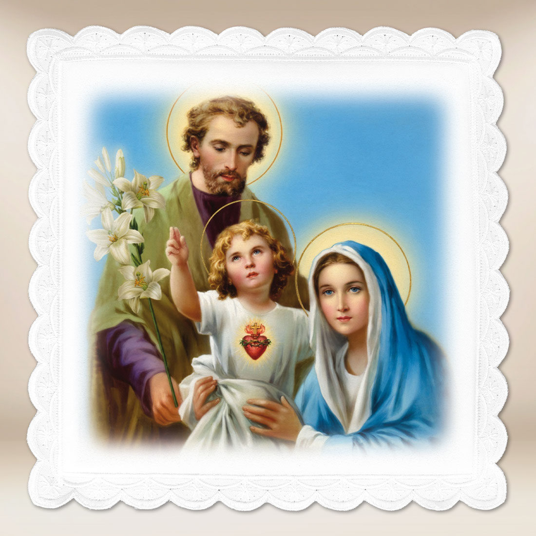 The photographic pall depicts the image of the Holy Family – Jesus, Mary, and Joseph – a symbol of love, unity, and domestic peace. The central figure is the young Jesus, pointing to His Heart, surrounded by rays that emanate grace and blessing. On either side stand Mary in a blue veil and Joseph with a lily, a sign of purity and protection. The entire scene is rendered in a light, warm color palette that creates an atmosphere of tranquility, faith, and hope.