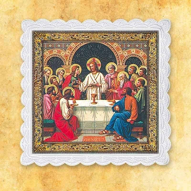 The pall is made of high-quality white liturgical fabric with a satin sheen, guaranteeing an elegant appearance and durability for years of use. The high-quality photographic print faithfully reproduces every detail, preserving the intensity of the colors and the spiritual dimension of the scene depicted. The whole is finished with a delicate, ecru-colored lace trim, which emphasizes its liturgical character and gives it a lightness.