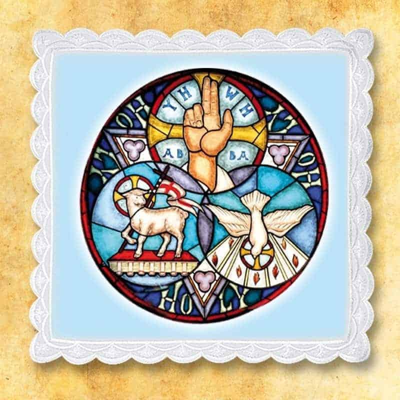 Photo no. 35 is a unique piece of chalice linen that combines spiritual meaning with artistic beauty. Its surface features a richly decorated image inspired by a sacred stained-glass window, depicting the symbols of the Holy Trinity – the open hand of God the Father, the Lamb of God, and the Holy Spirit in the form of a dove. The whole is kept in deep blue and red colors, symbolizing divine glory, sacrifice, and light.The staff is made of high-quality white liturgical fabric with a satin finish, which ensures durability, resistance to creasing, and ease of care. The edges are finished with delicate lace trim, adding subtle elegance and class to the whole.