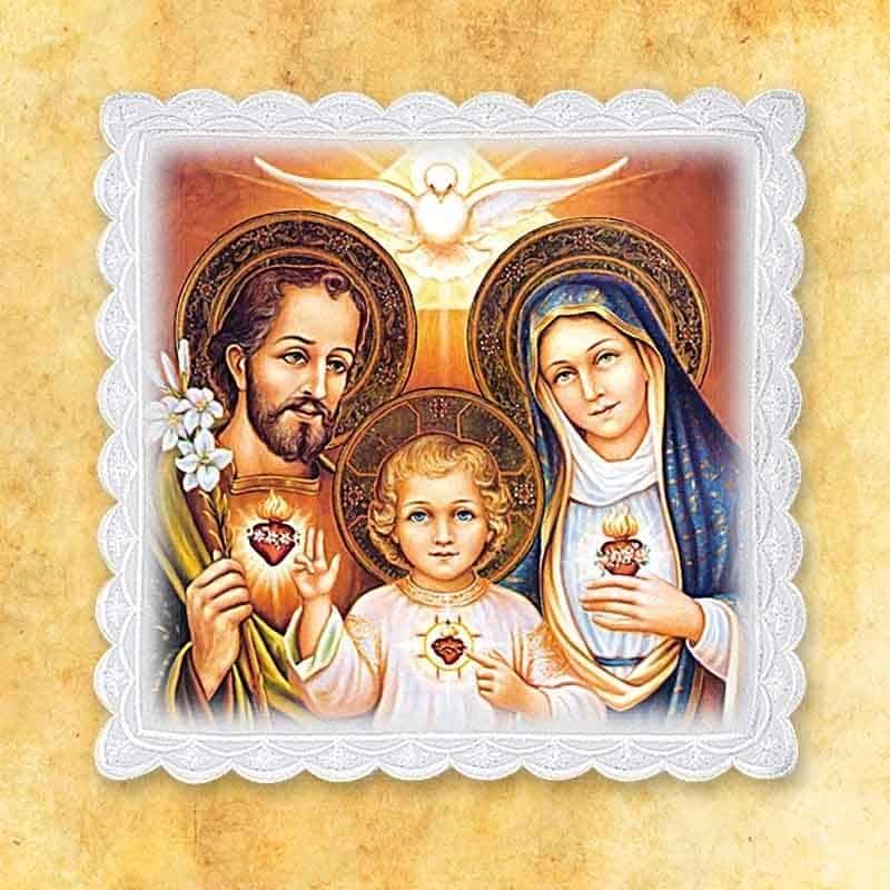 Photo no. 12 is a unique element of chalice linen depicting the Holy Family – Jesus, Mary, and Joseph – surrounded by the rays of the Holy Spirit. This beautiful image symbolizes the love, unity, and blessing that come from living in faith. The warm colors and subtle details create a harmonious composition that brings spiritual depth and an atmosphere of prayer to every liturgy.