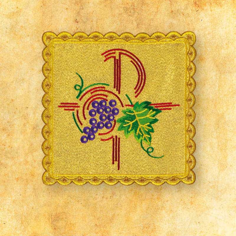 Gold embroidered palka No. 32 is an elegant element of chalice linen, made of high-quality liturgical fabric in gold. Decorated with precise embroidery depicting a vine and vine leaf incorporated into a cross, it symbolizes the Eucharist, spiritual life, and unity with Christ.