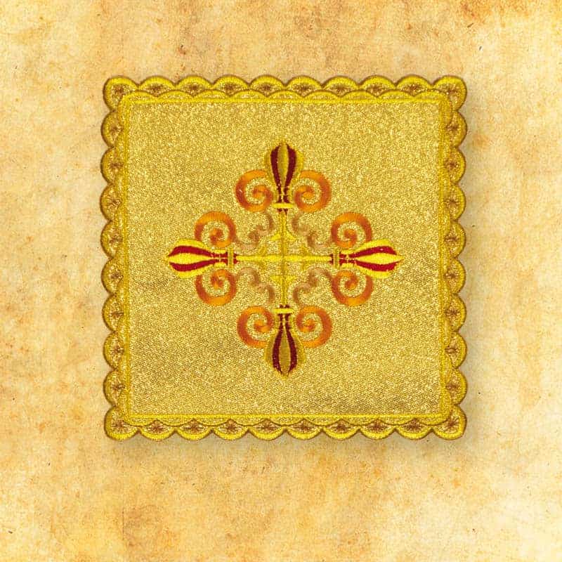 Gold embroidered palka No. 33 is an elegant element of chalice linen, made of high-quality liturgical fabric in gold. Decorated with delicate embroidery in the form of a stylized cross with soft, ornamental lines, it symbolizes light, glory, and the divine presence in the liturgy.Each embroidered pall is created in the workshop of Urbanowicz Haft Polska, where the tradition of Polish sacred embroidery is combined with craftsmanship precision and artistic sensibility. The fabric with a subtle sheen, golden threads, and decorative trim create a harmonious whole that stands out for its elegance and durability.The golden color, symbolizing divinity, joy, and Resurrection, makes the pallet perfect for Easter, Corpus Christi, First Holy Communion, and all solemn celebrations. It is a combination of spiritual symbolism, tradition, and high aesthetic value that emphasizes the beauty of every liturgy.lt;/p>